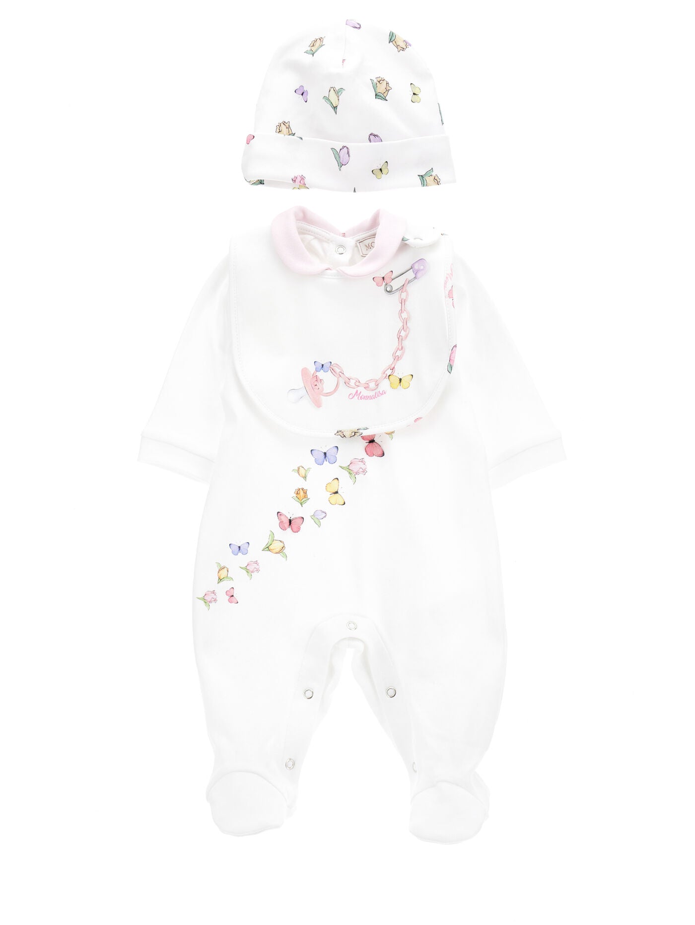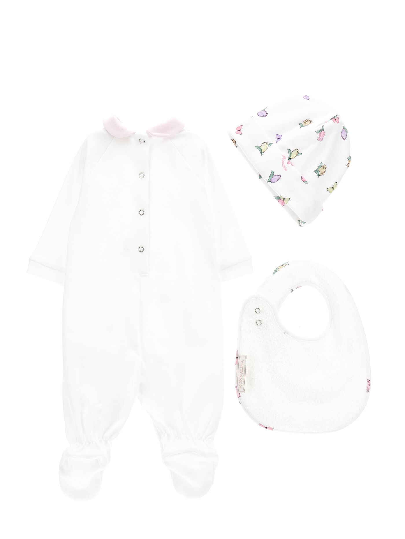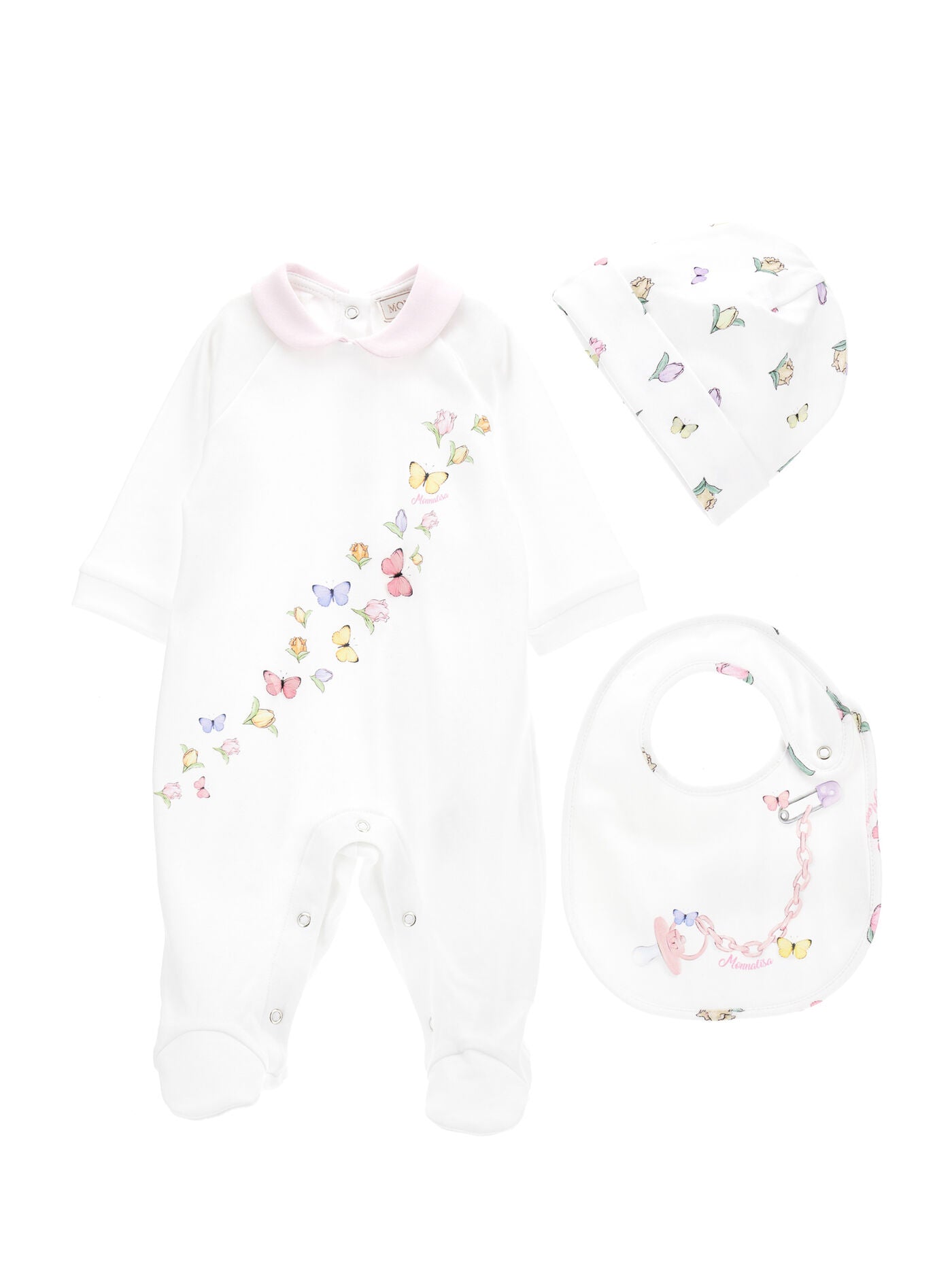 Birth set consisting of a playsuit, bib and matching bonnet with a butterfly print