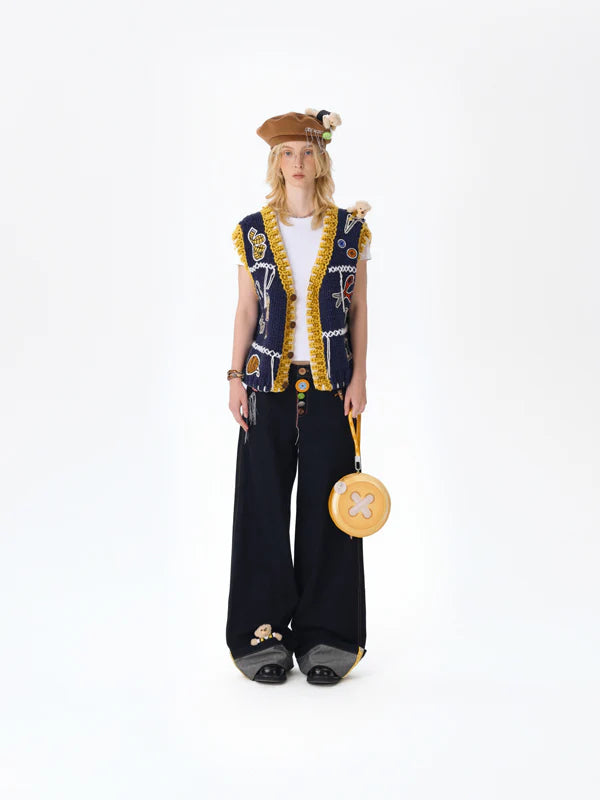 13DE MARZO Chunky Needle Graffiti Cardigan Sweater V-Neck Knitted Jacket in Black