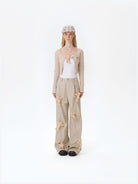 These pleated cargo pants reinterpret classic utility wear with a distinctive sculptural twist. Six precise front pleats are artfully crafted to create the illusion of a teddy bear pinching the fabric, adding playful dimensionality and reinforcing the brand’s signature character design. The flat-embroidered logo sits neatly along the pocket edge, accented by bright silver hardware for a subtle industrial touch.