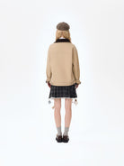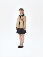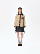The checked inner lining offers both comfort and an elevated finish. The front and back yoke seams add structure, while the embossed leather logo patch sits neatly beneath the front panel division. The flap pockets feature antique bronze eyelets and horizontal button chains adorned with removable 3D mini clothing charms in various colors and forms. A plush teddy bear detail is placed at the pocket, creating a lively focal point that embodies the brand’s playful DNA.