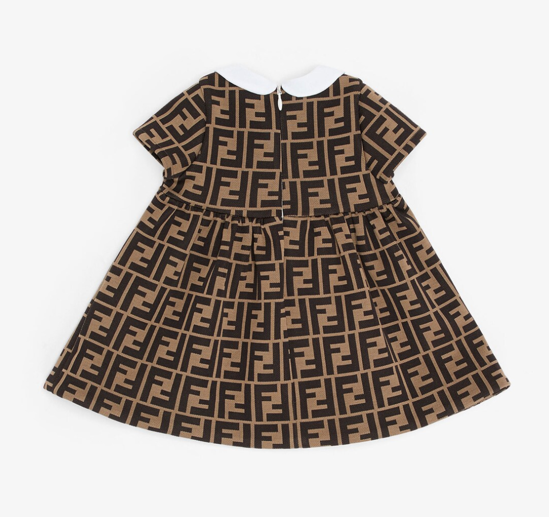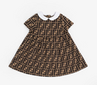 Jacquard fabric baby girl dress with tobacco brown, all-over FF logo and white collar.