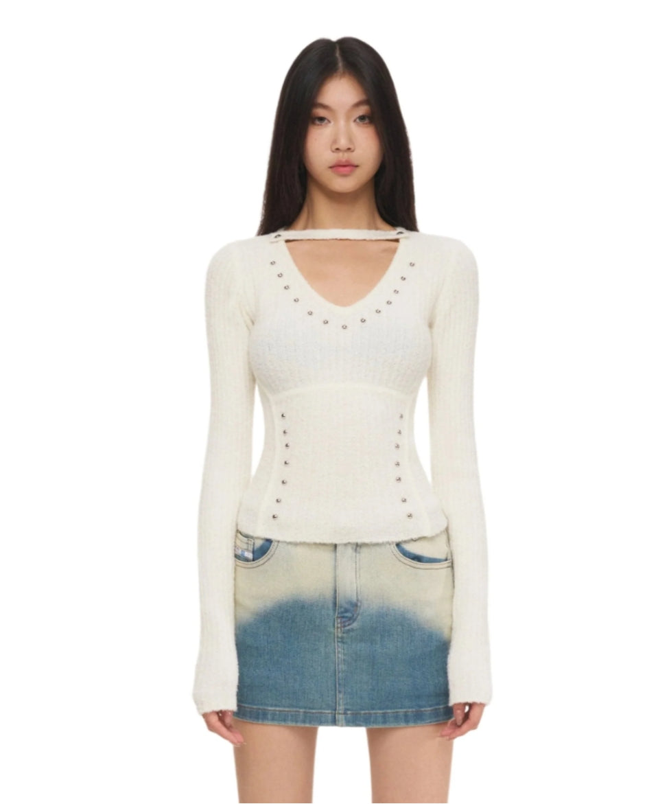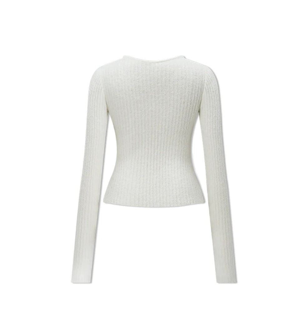 MACYMCCOY V-NECK RAW EDGE SLIM KNIT CARDIGAN TOP WHITE