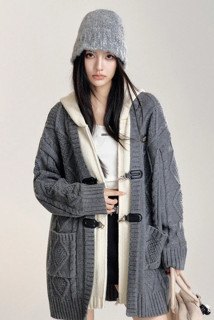 MACYMCCOY FAKE-2-PIECE HOODED SILHOUETTE KNIT CARDIGAN GRAY