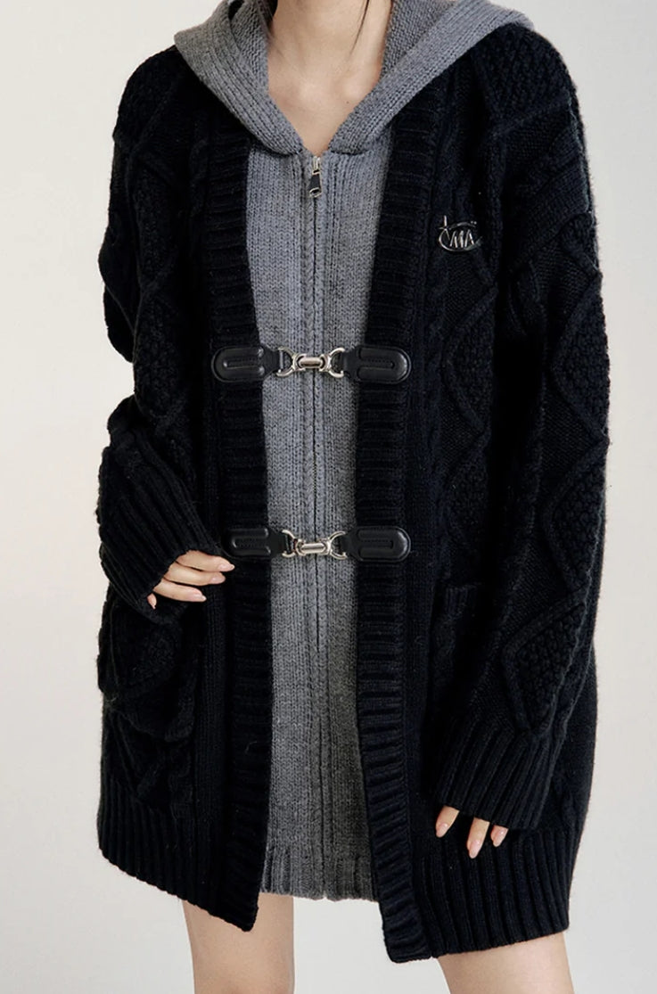 MACYMCCOY FAKE-2-PIECE HOODED SILHOUETTE KNIT CARDIGAN BLACK