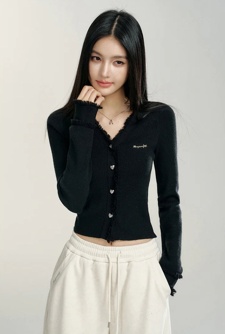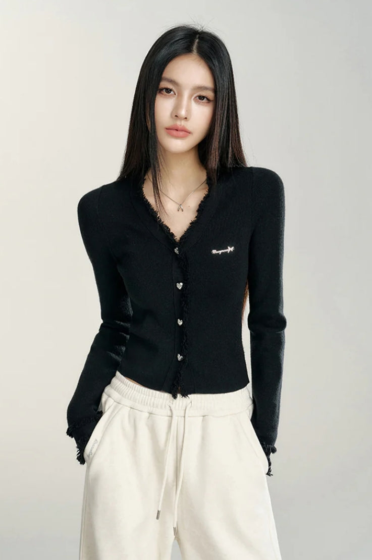 MACYMCCOY V-NECK RAW EDGE SLIM KNIT CARDIGAN TOP BLACK