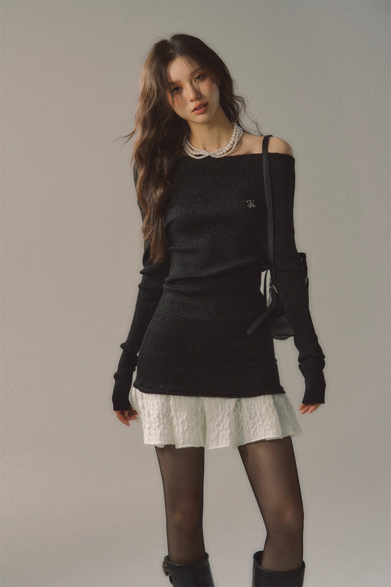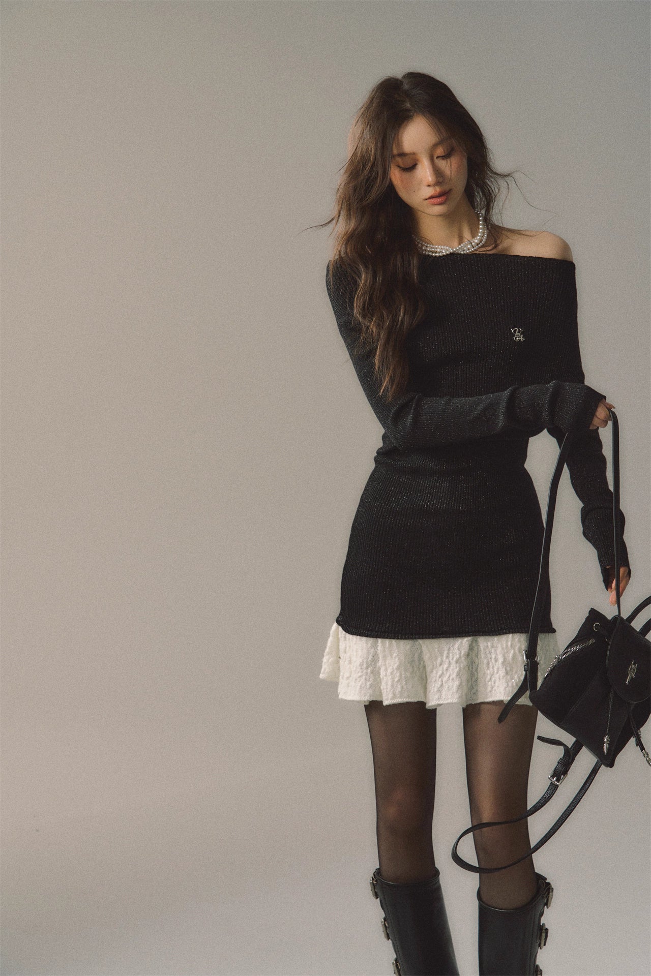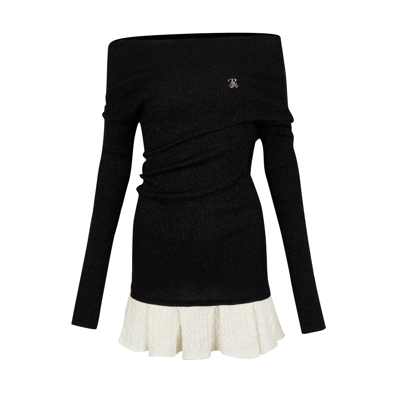VIA PITTI Asymmetric Off-Shoulder Color-Block Knit Dress - Black
