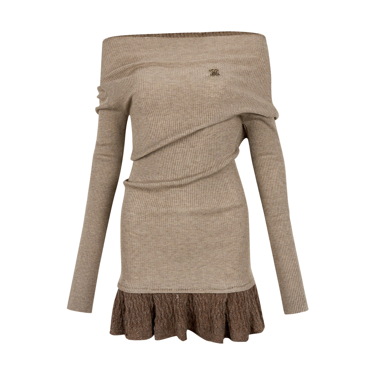 VIA PITTI Asymmetric Off-Shoulder Color-Block Knit Dress - Khaki
