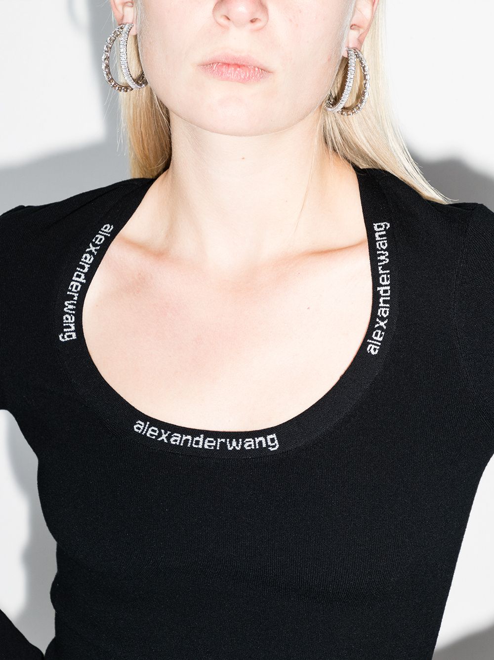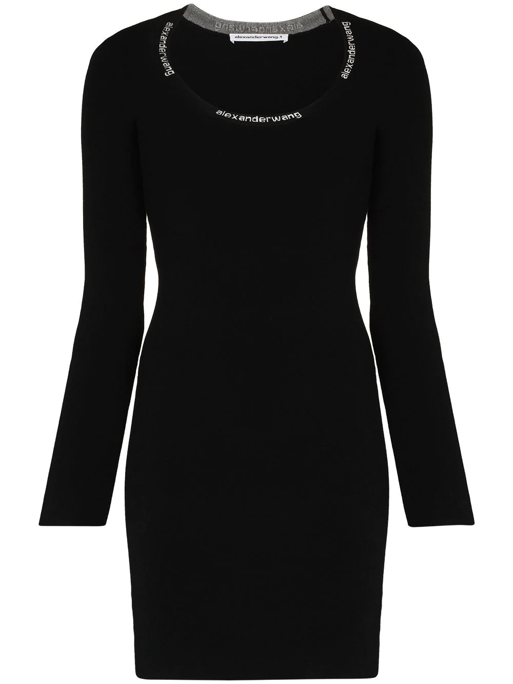 Black logo-trim bodycon mini dress from ALEXANDER WANG featuring logo print at the neckline, scoop neck, long sleeves, stretch-design, straight hem, above-knee length and fitted silhouette.