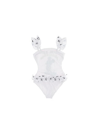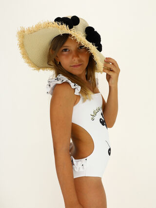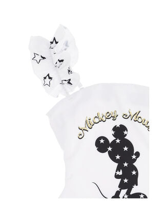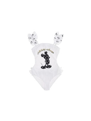 - Cute girl's one-piece swimsuit with plays of ruffles and the unmistakable Mickey Mouse silhouette