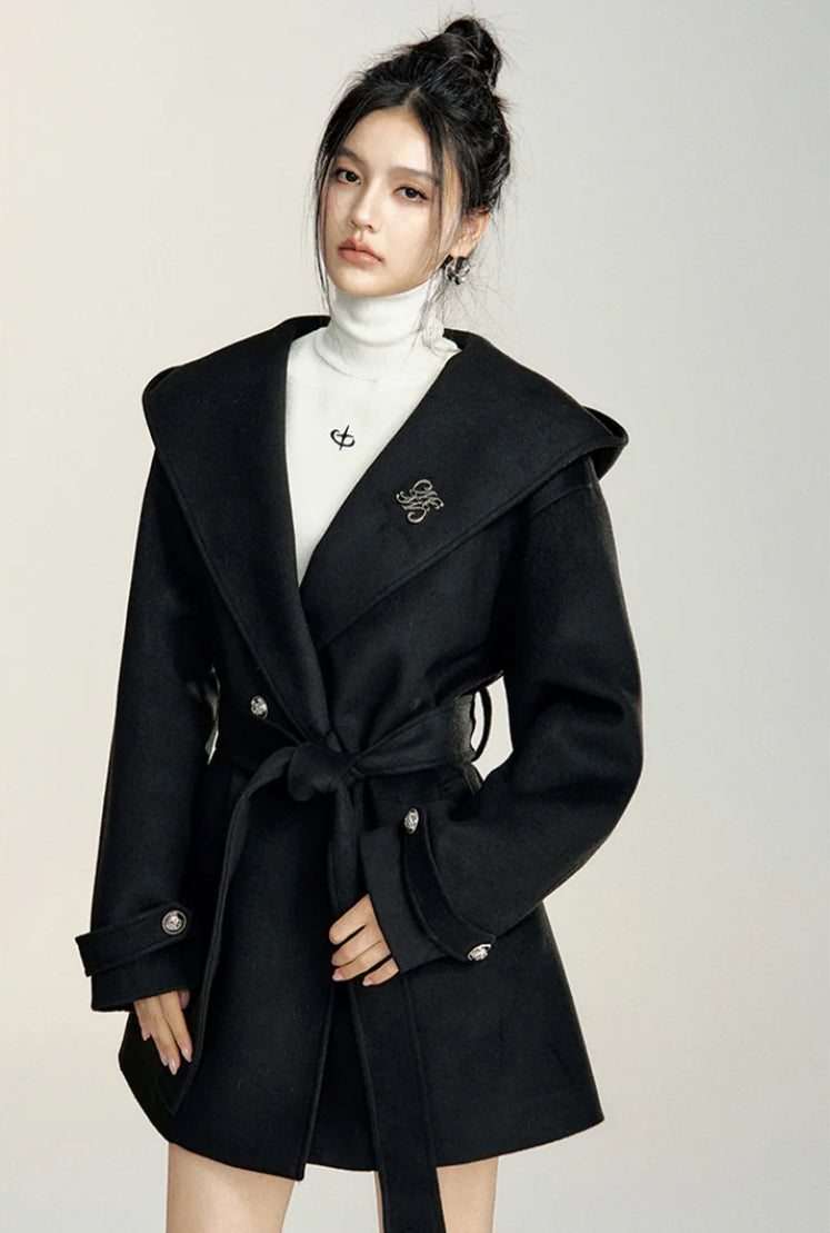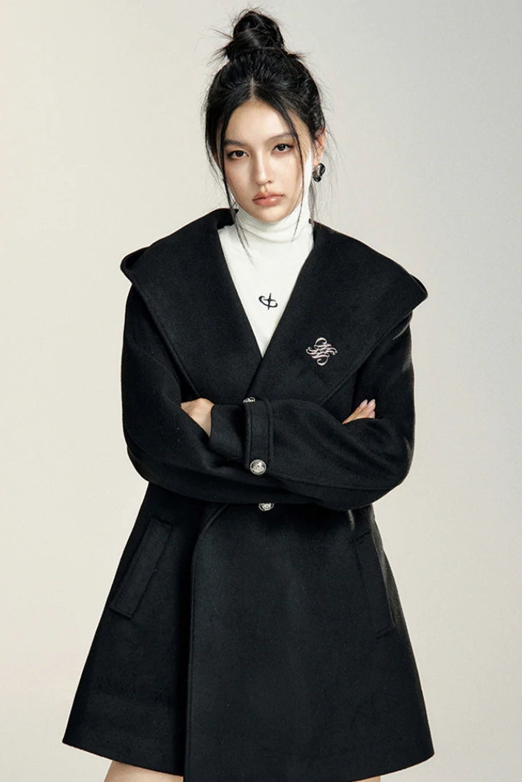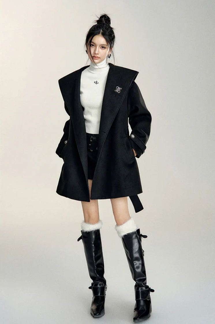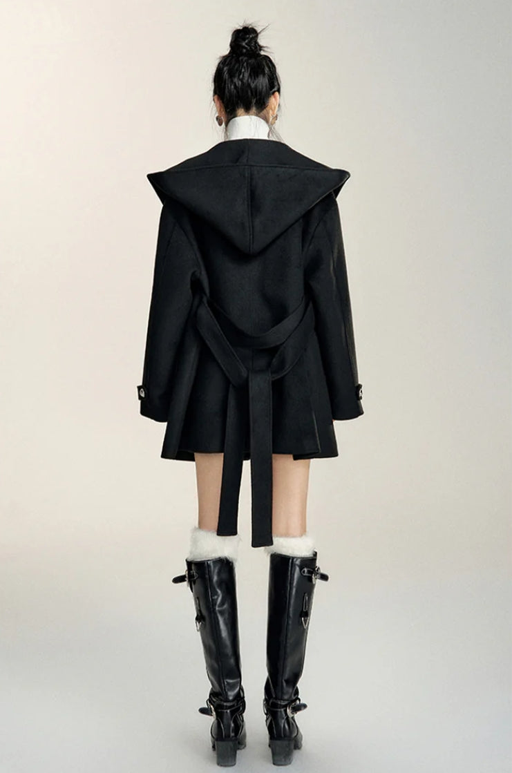 MACYMCCOY FAKE-2-PIECE HOODED SILHOUETTE KNIT CARDIGAN BLACK