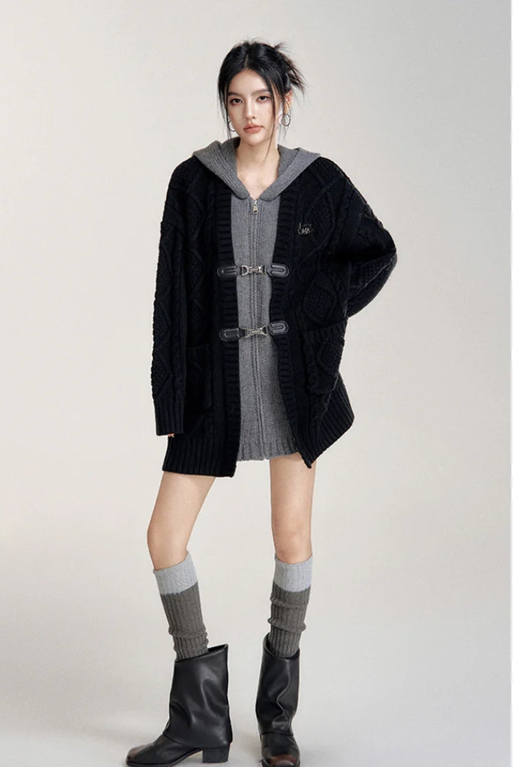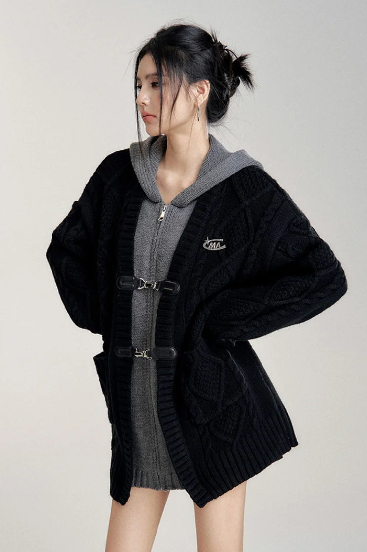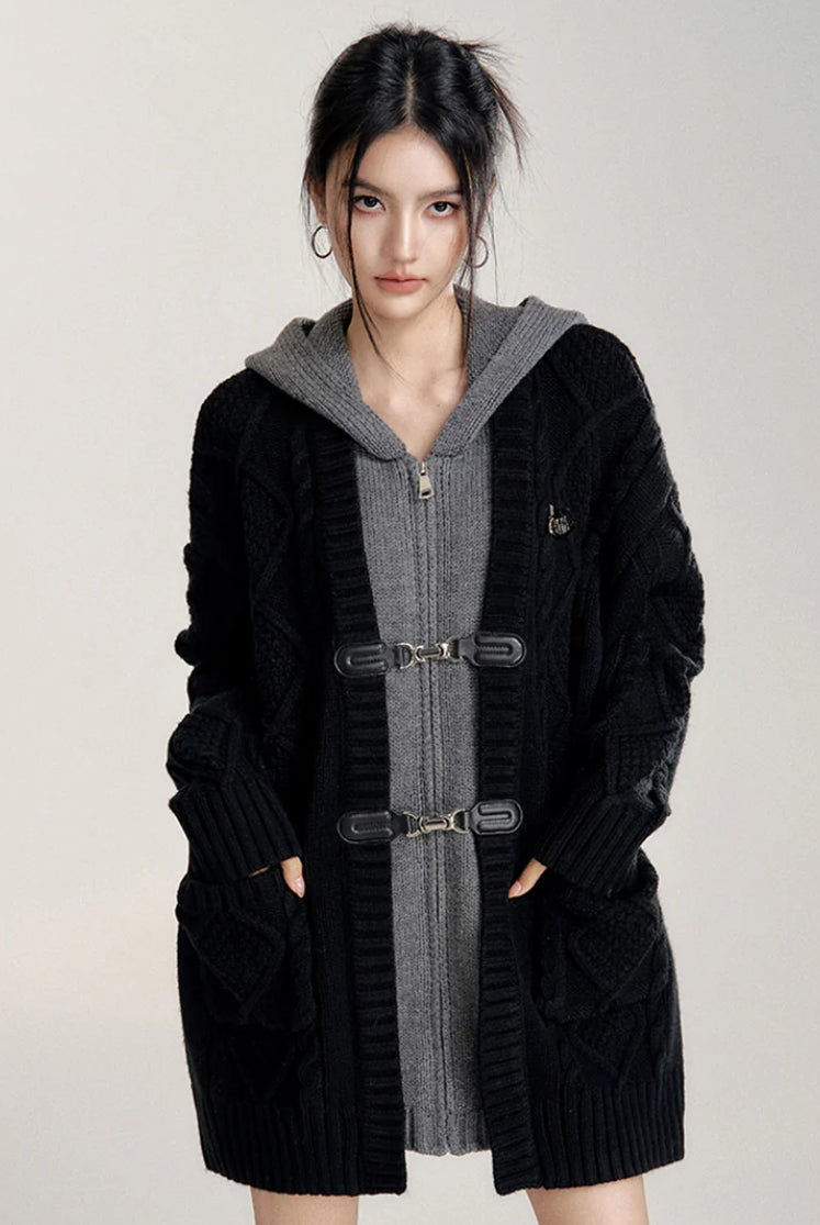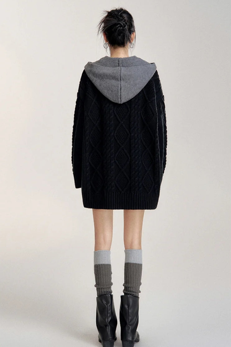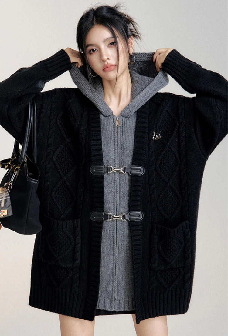 MACYMCCOY FAKE-2-PIECE HOODED SILHOUETTE KNIT CARDIGAN BLACK