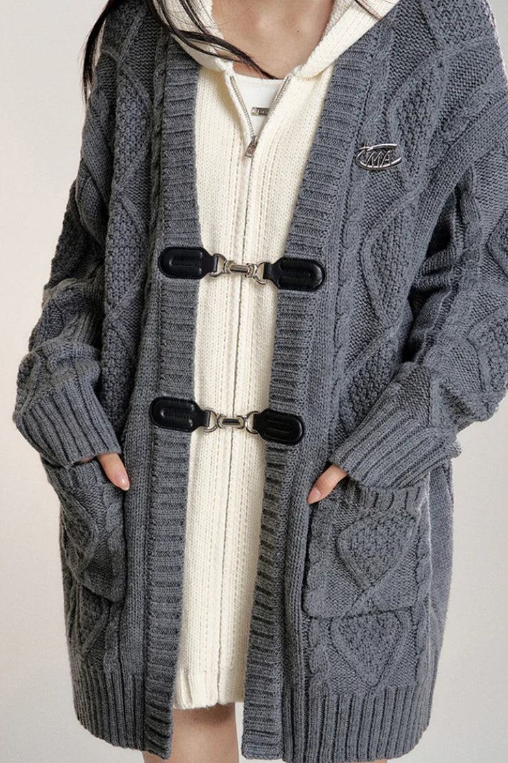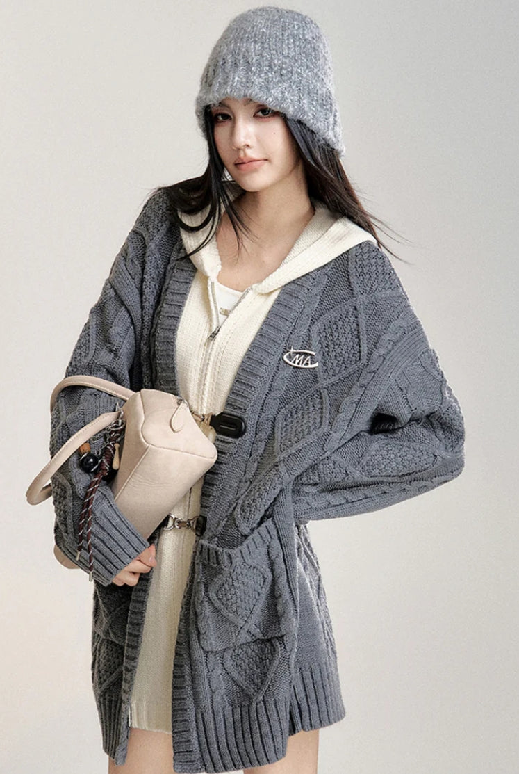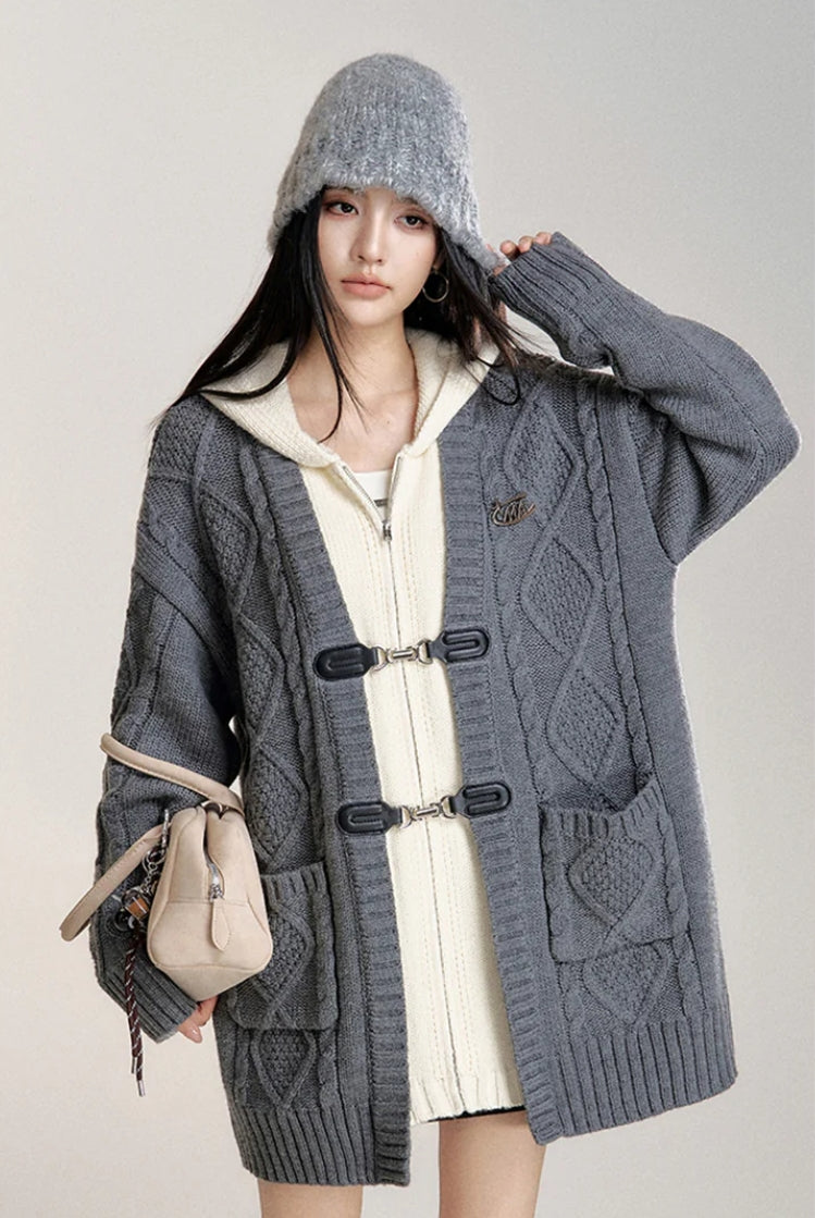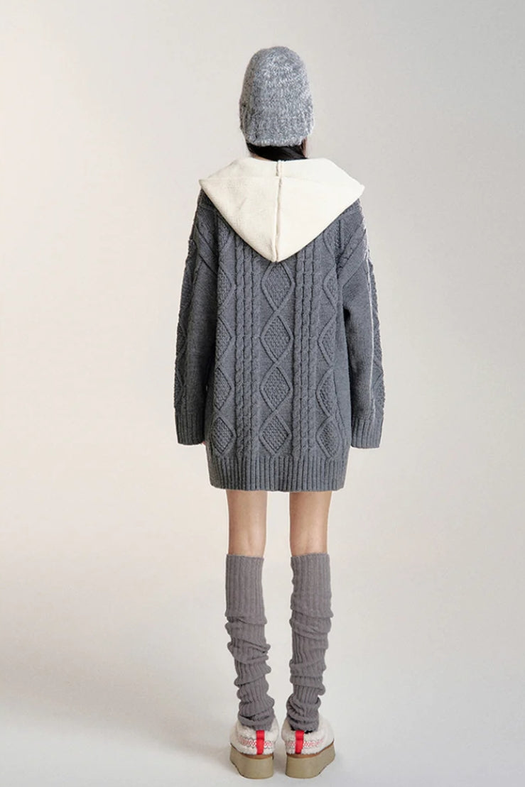 MACYMCCOY FAKE-2-PIECE HOODED SILHOUETTE KNIT CARDIGAN GRAY