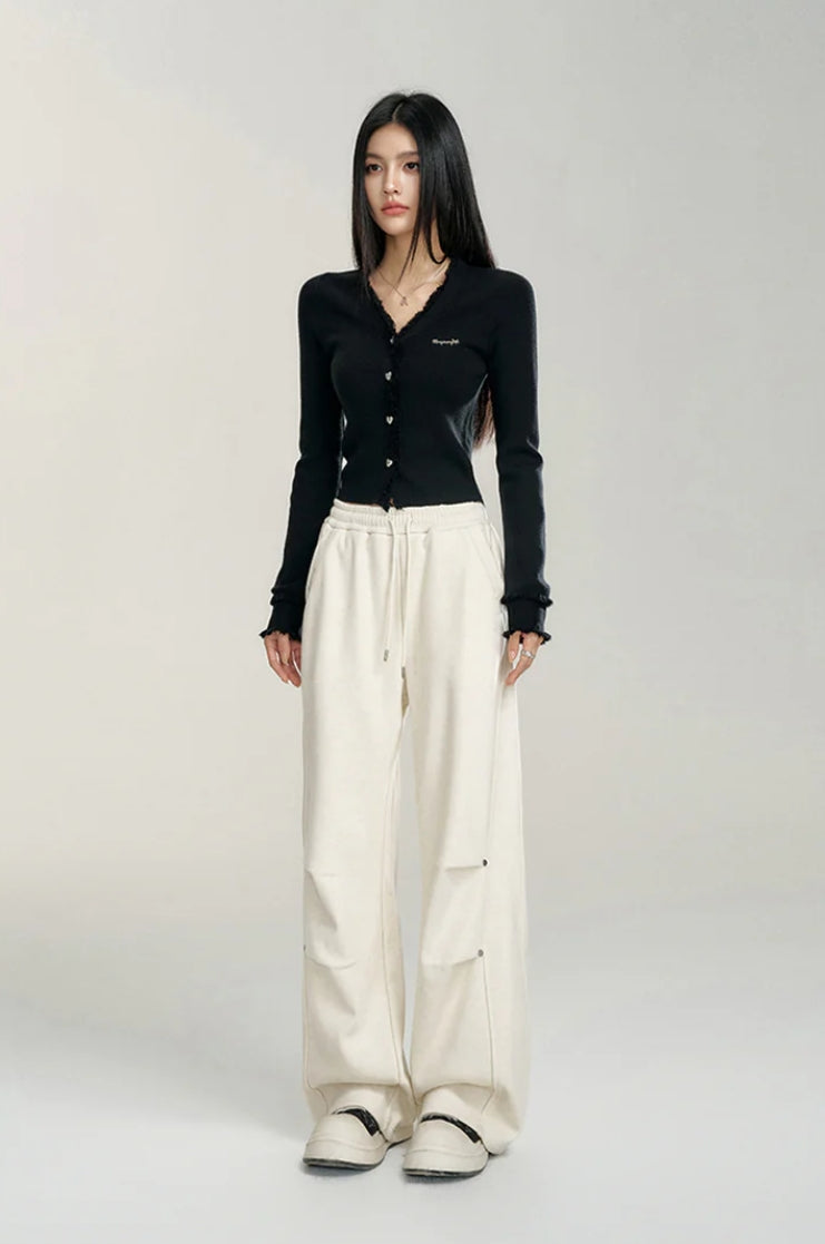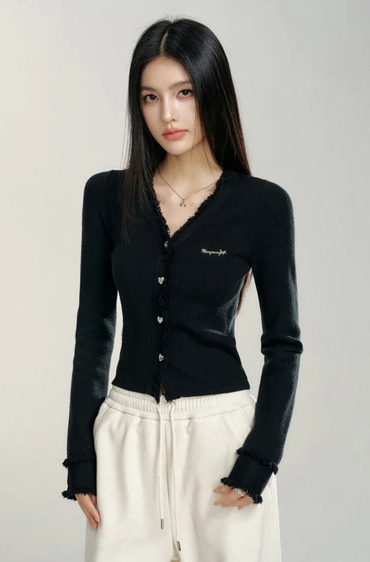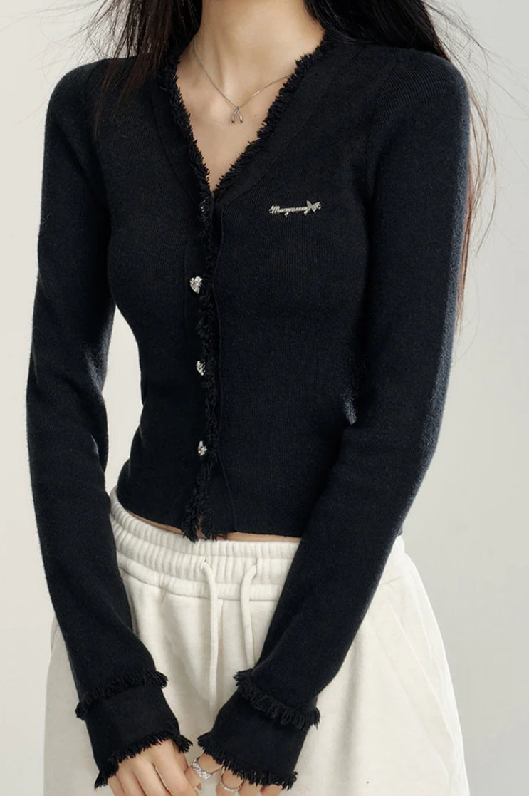 MACYMCCOY V-NECK RAW EDGE SLIM KNIT CARDIGAN TOP BLACK