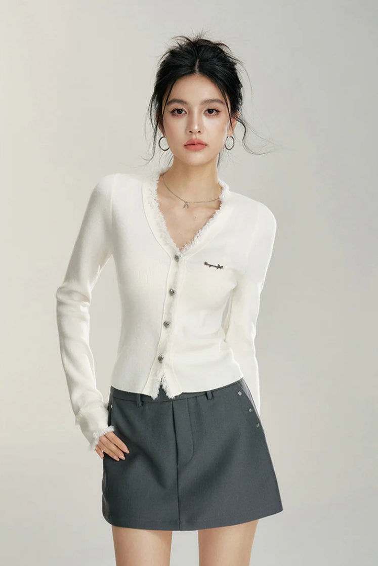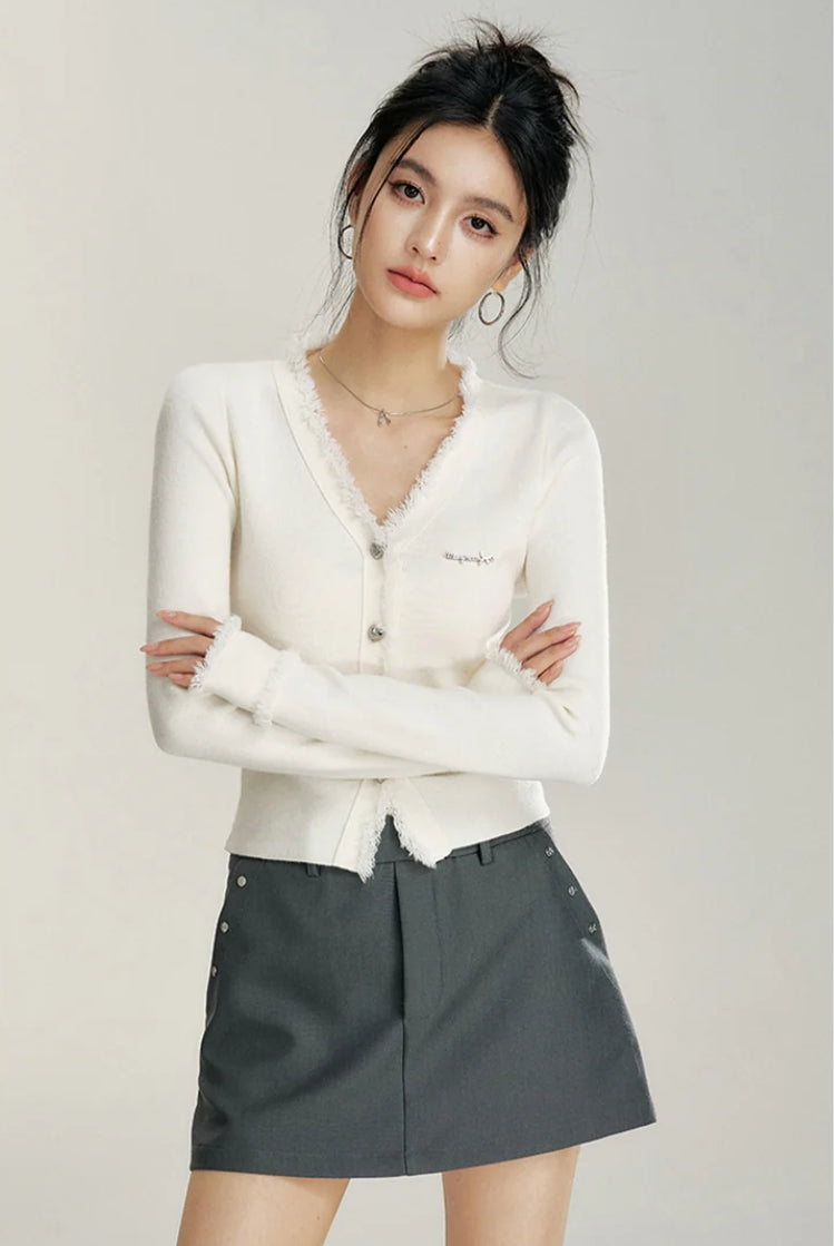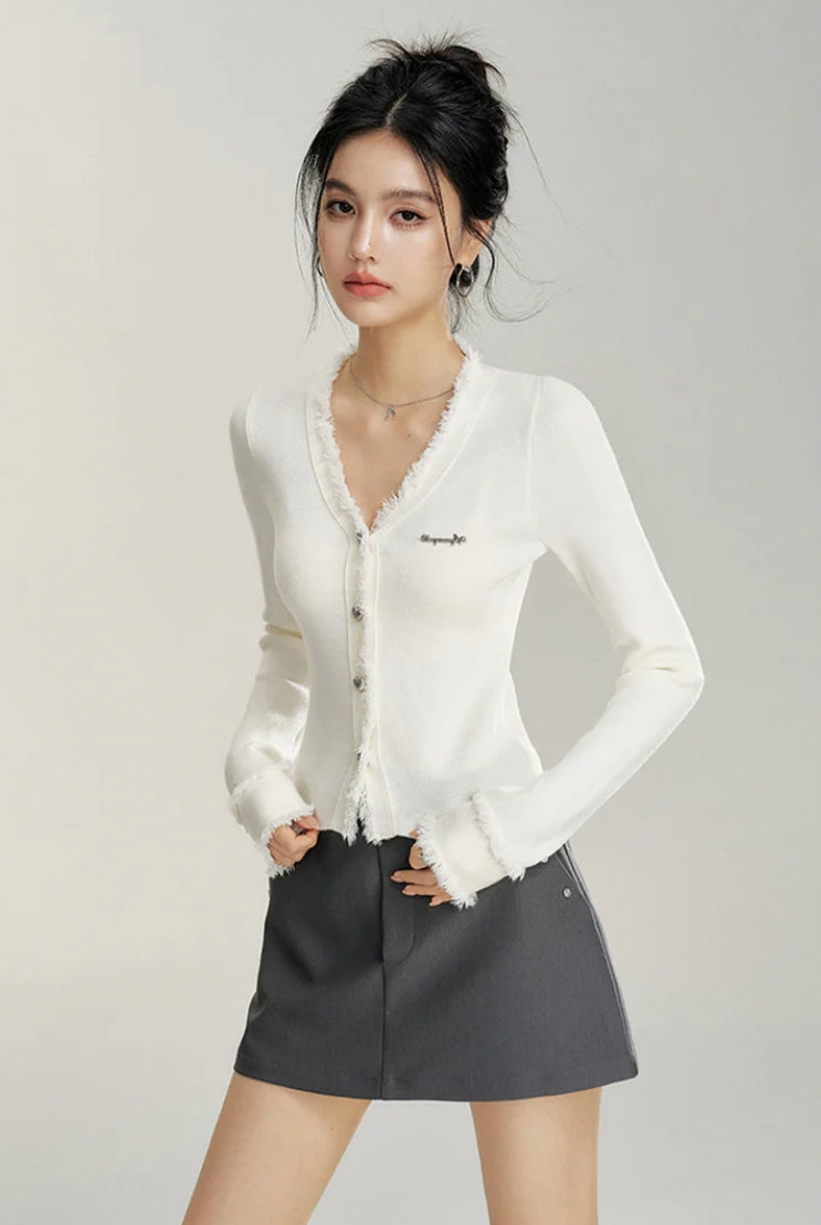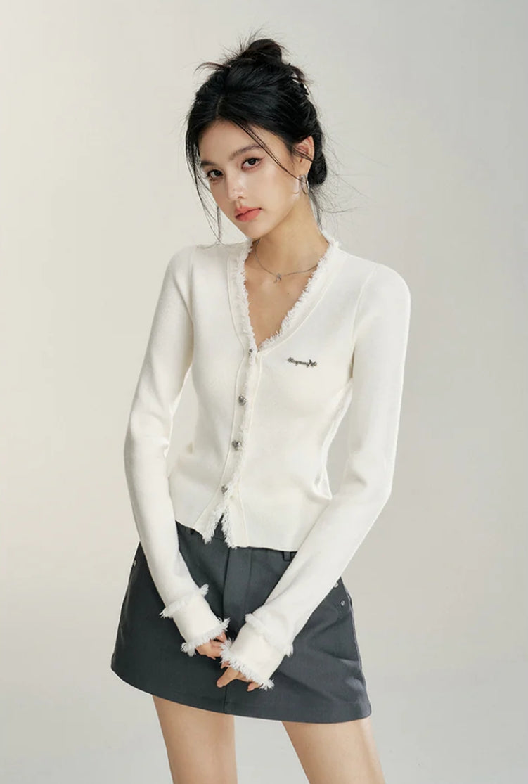 MACYMCCOY V-NECK RAW EDGE SLIM KNIT CARDIGAN TOP WHITE