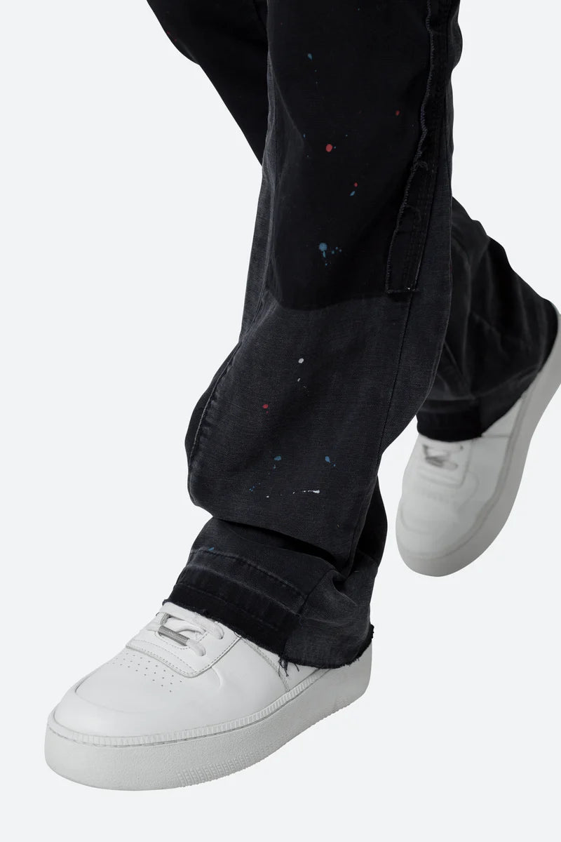 the B243 Flare Denim are designed with our new B fit, which is slim through the thigh and features a slight flare at the leg opening and is constructed from washed brown duck twill, work pants panelling removed after wash for contrasting wash area, panelling at the inseam and outseam for a slight flare, paint splatter throughout, and finished with a deconstructed hem.