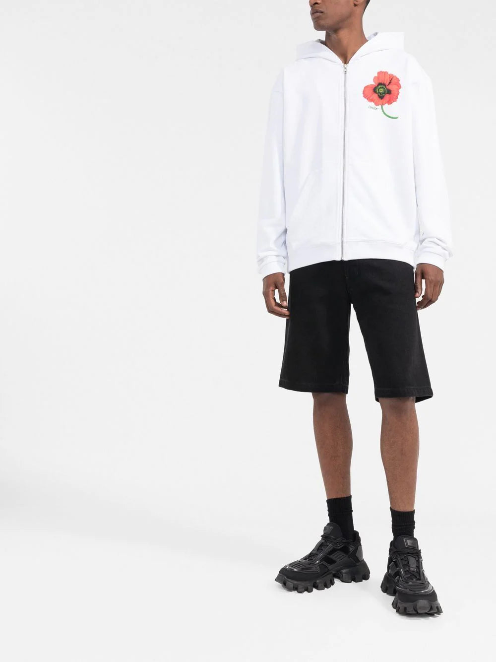 'Kenzo Poppy' graphic-print hoodie from KENZO featuring white, red, cotton, poppy print, logo print at the chest, logo print to the rear, classic hood, front zip fastening, drop shoulder, long sleeves, ribbed cuffs and ribbed hem.