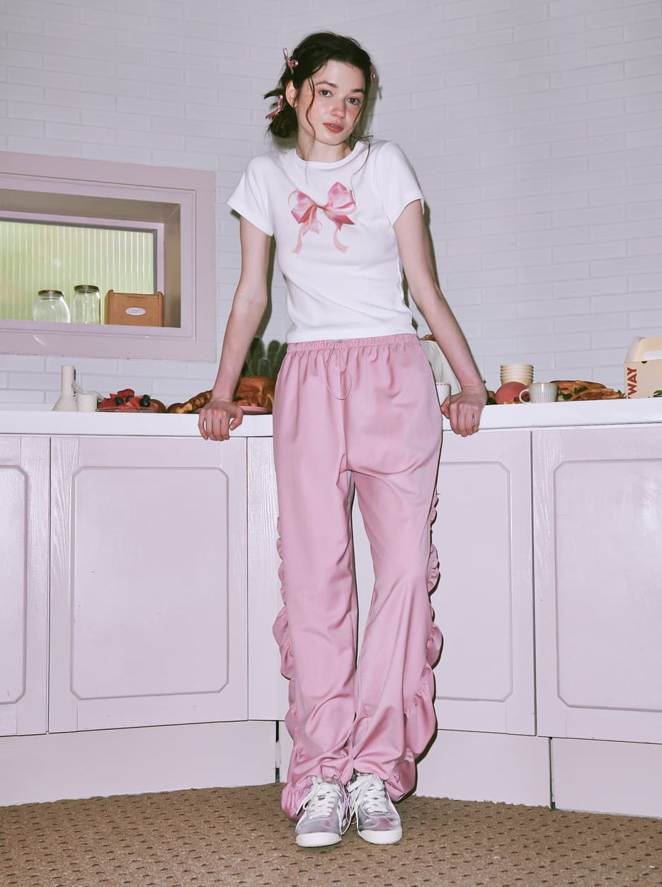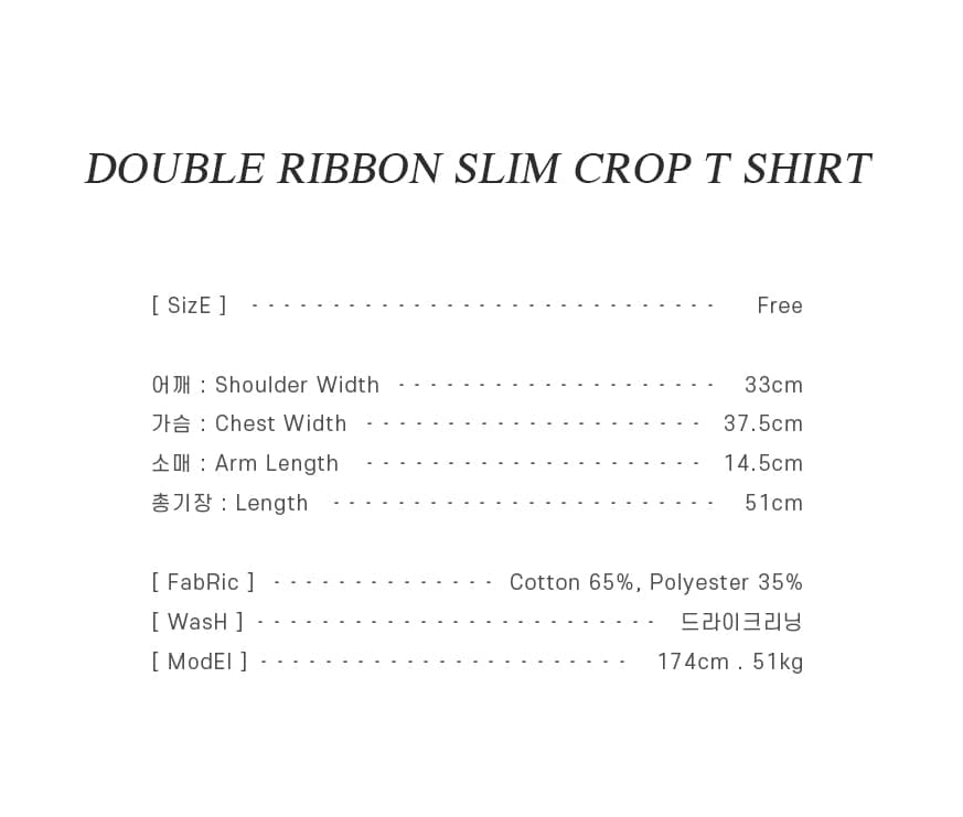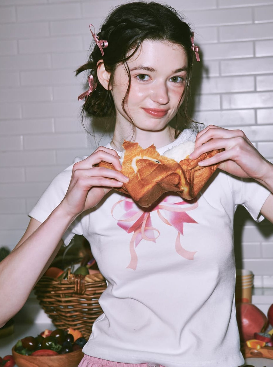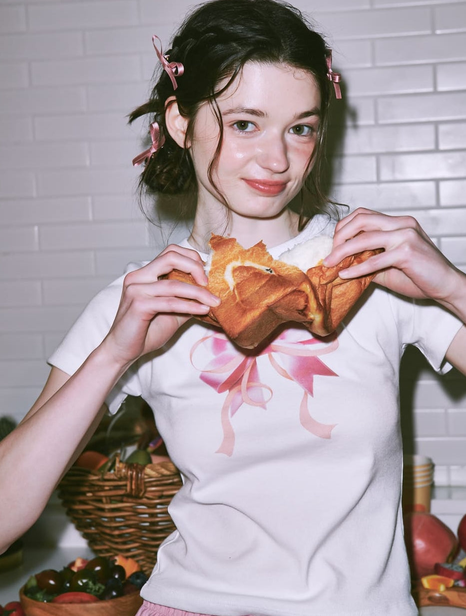 RONRON DOUBLE RIBBON SLIM CROP T SHIRT WHITE PINK