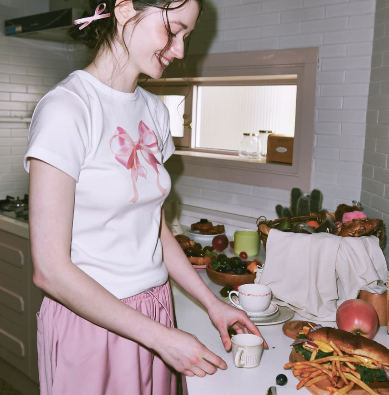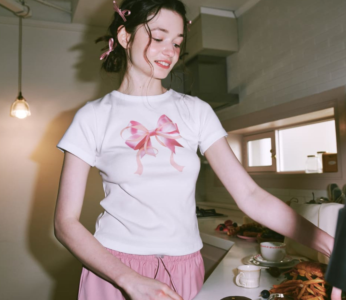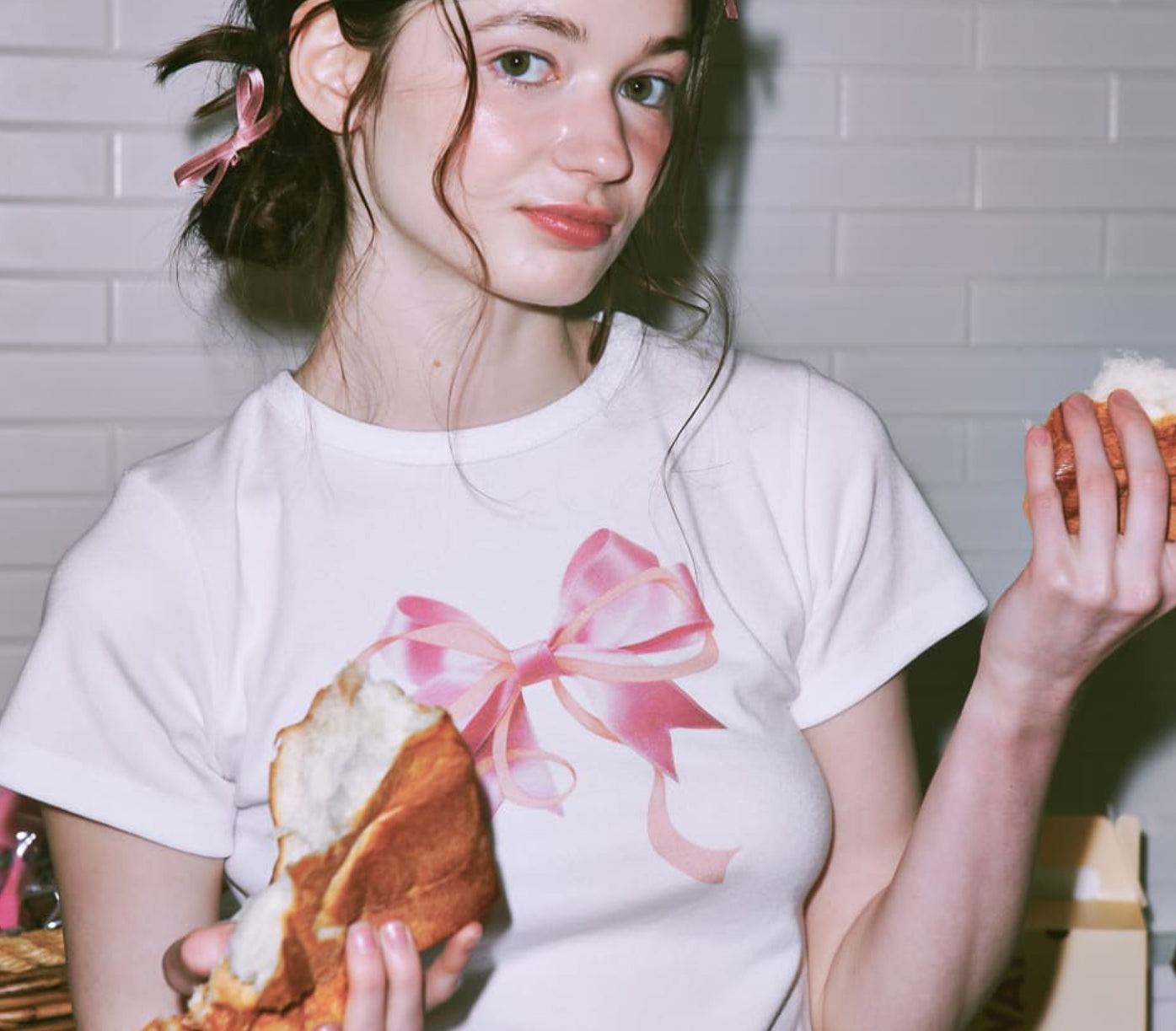 RONRON DOUBLE RIBBON SLIM CROP T SHIRT WHITE PINK