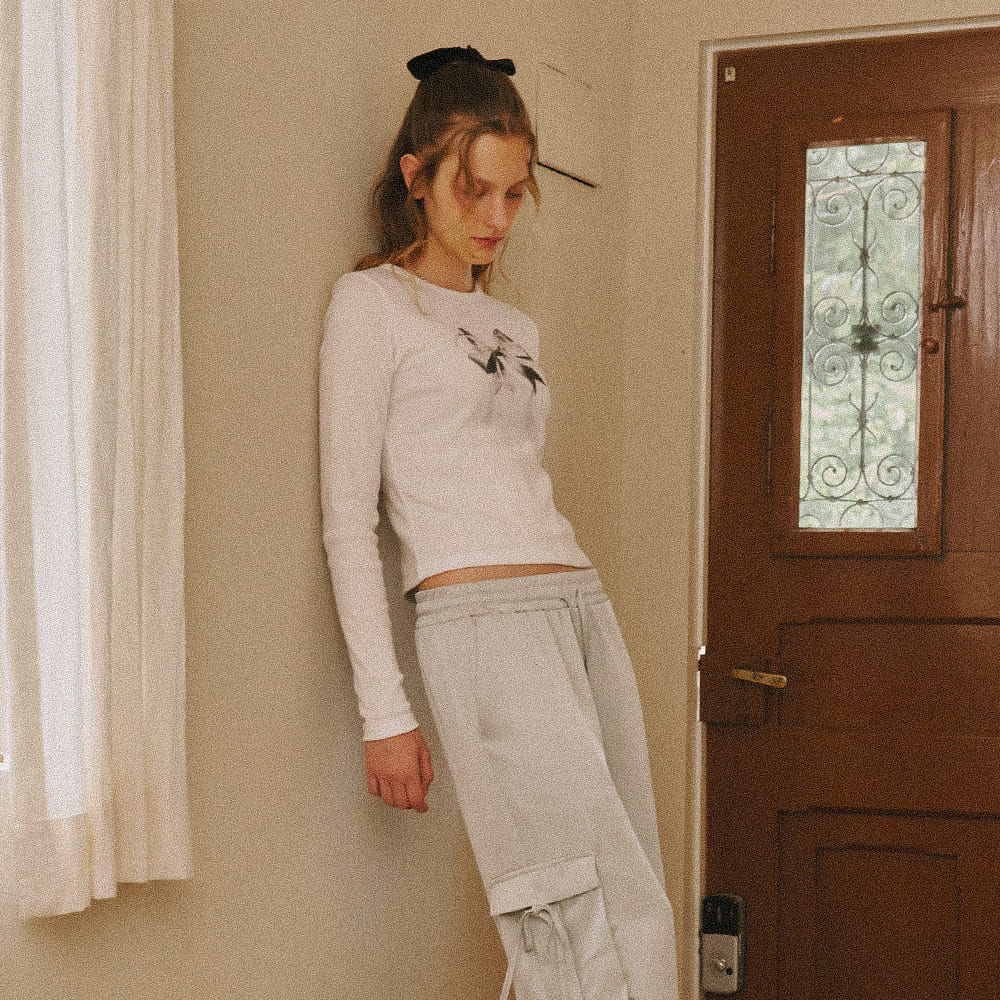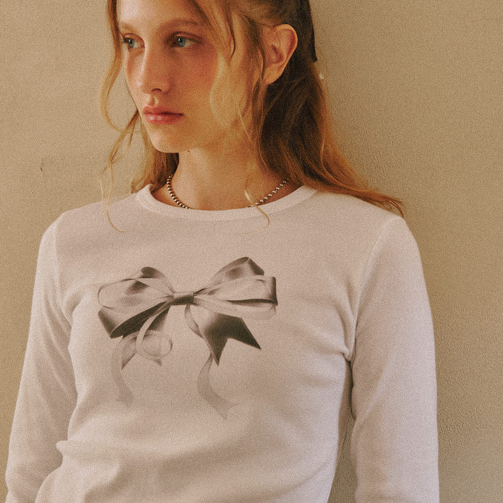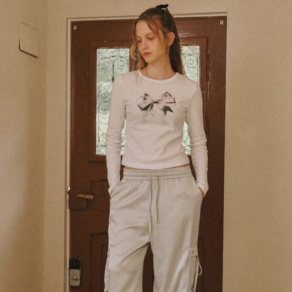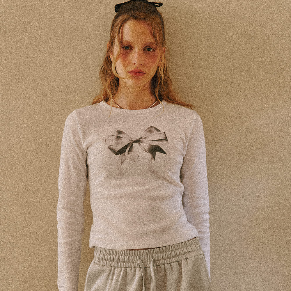 RONRON DOUBLE RIBBON SLIM CROP LONG SLEEVE WHITE SILVER