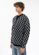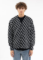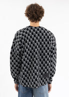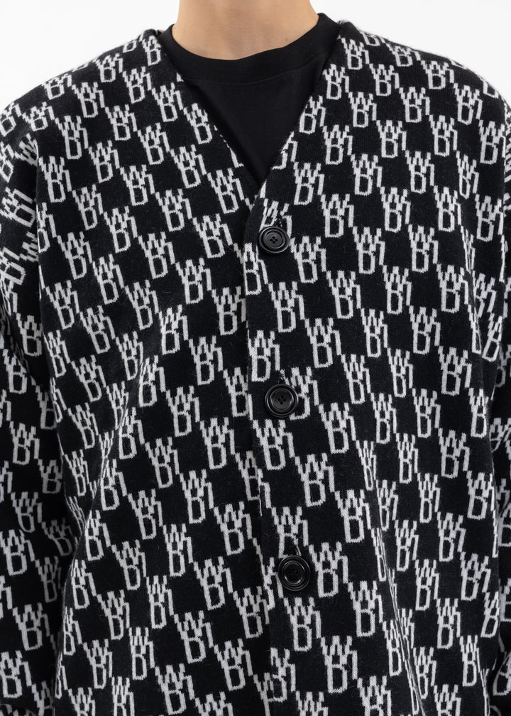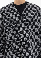 Black and white wool-blend reversible cardigan. Features an all-over jacquard logo print. Tonal button fastening along the front. Pocket on either hip. Finished with a flat hem.