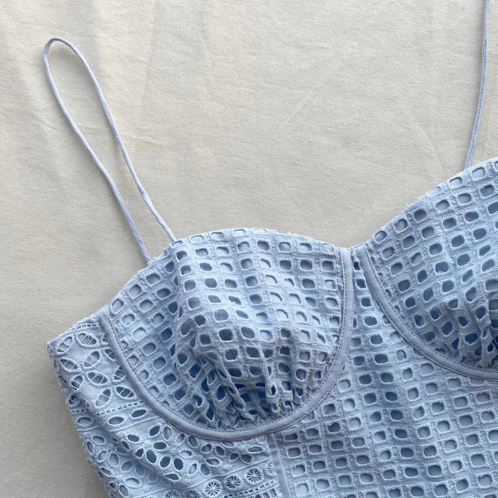 With its sculpting bodice and tiered mini skirt, this baby blue broderie anglaise number was designed to be a seasonal classic. Spaghetti straps keep everything in place and wired cups provide extra support. Go monochrome and layer it under a light wash denim jacket at Sunday brunch, and style it simply with strappy sandals on your next seaside escape. Check the Size Guide to find your perfect fit.