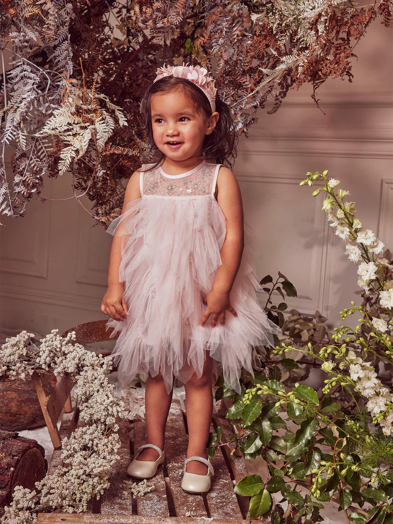 She'll be the fairest of them all in the Bébé Star Light Tulle dress in Porcelain Pink.