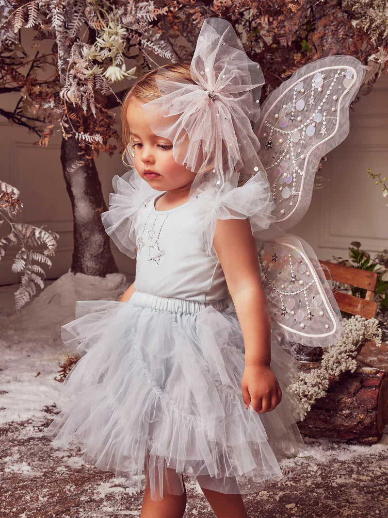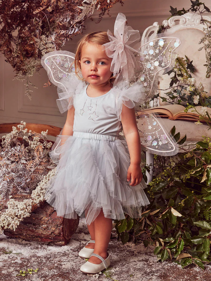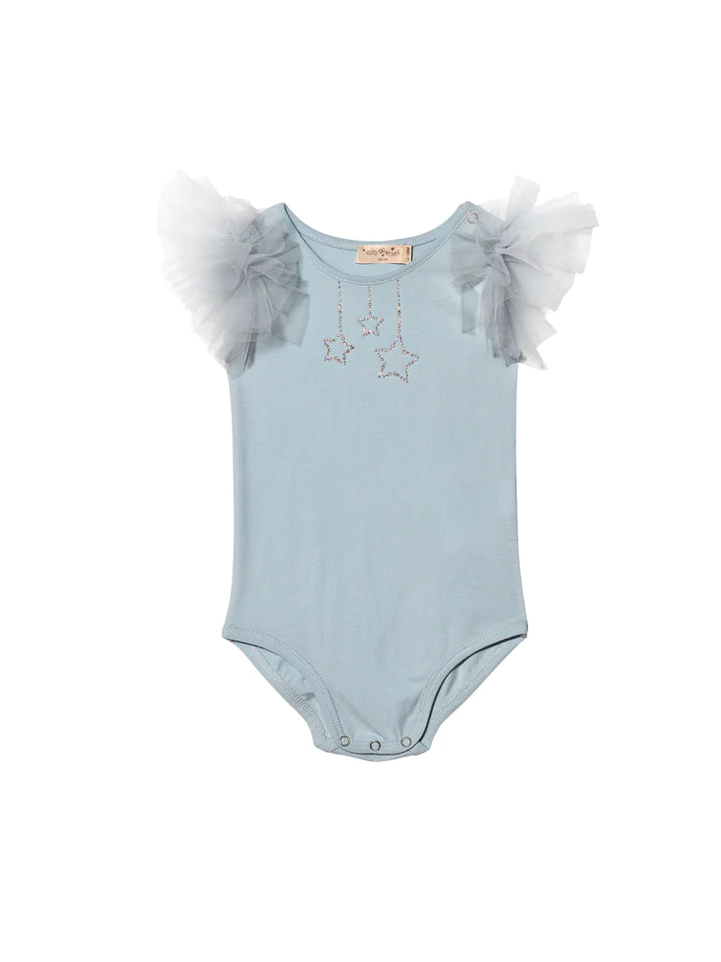 Made from a soft stretch cotton jersey, this versatile piece features tulle ruffles decorating the shoulders, and glittering embellishments to form a dazzling stars across the front.