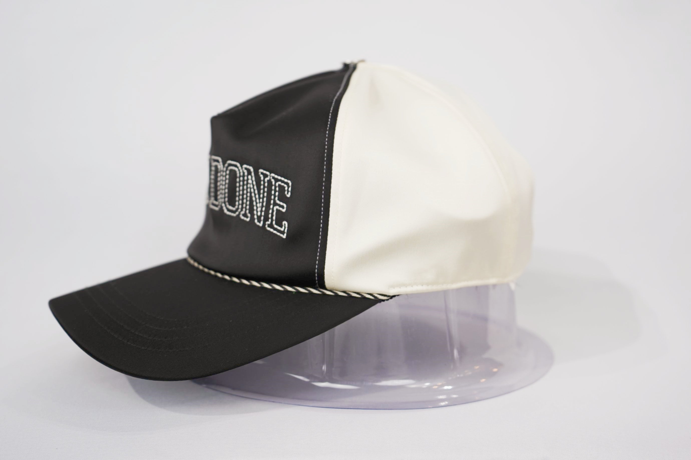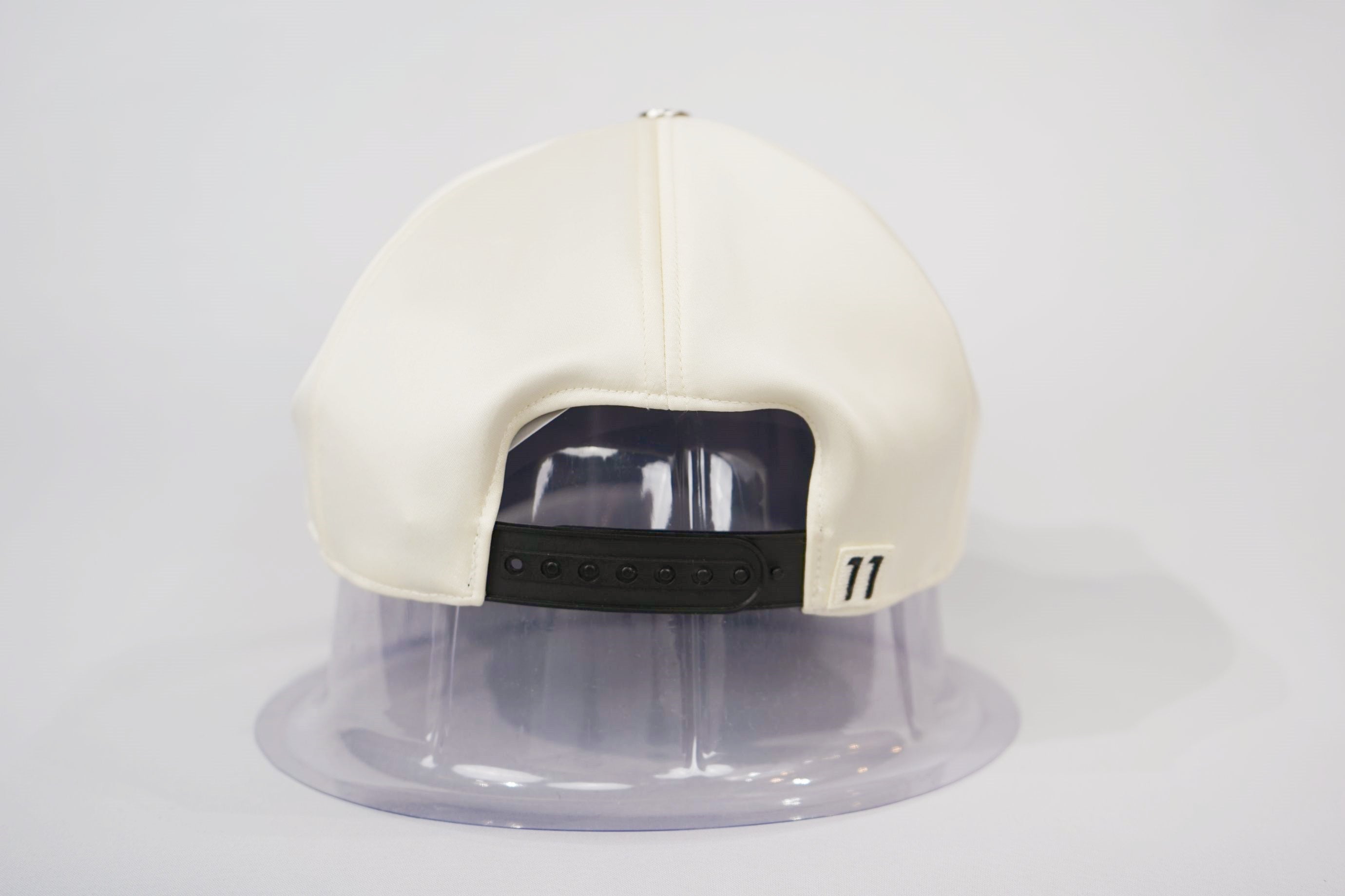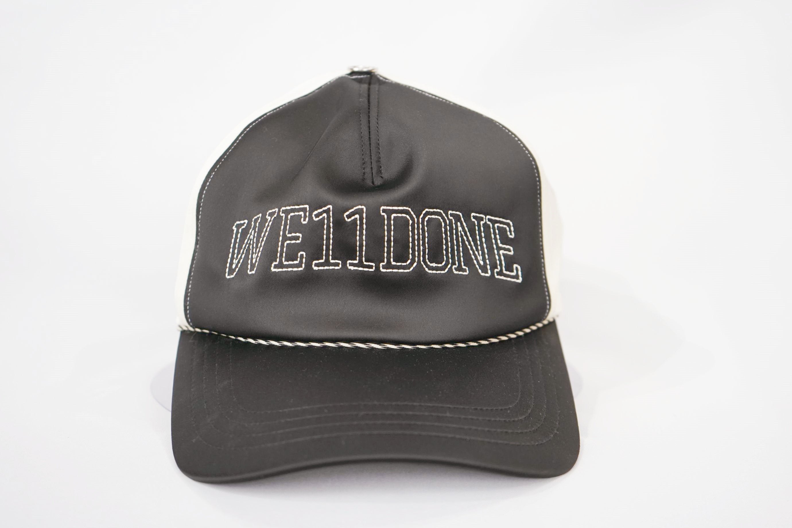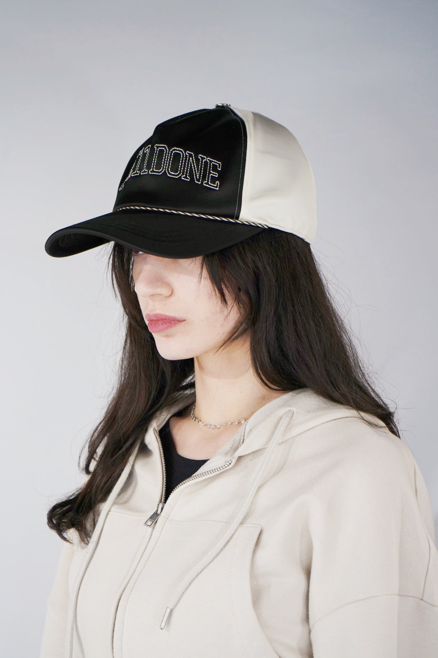 Black and ivory satin cap. Features a collegiate inspired text print across the front face. Dual tone decorative piping at the top of the brim. Sculpted silver-tone button at the peak. Branded logo tag at the rear fastening strap. Finished with tonal stitching, and black lining. Adjustable fit.