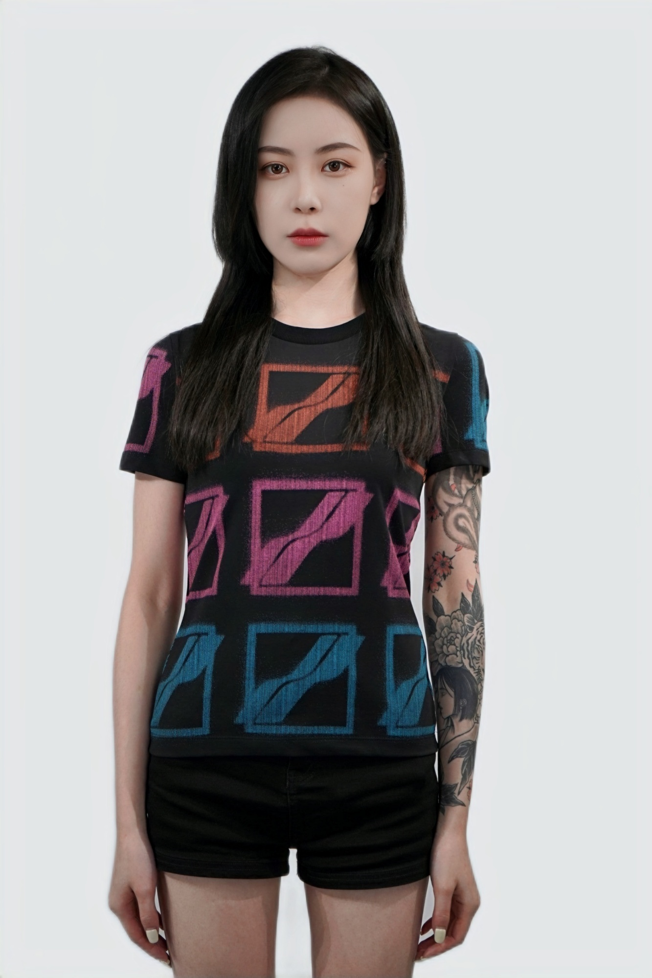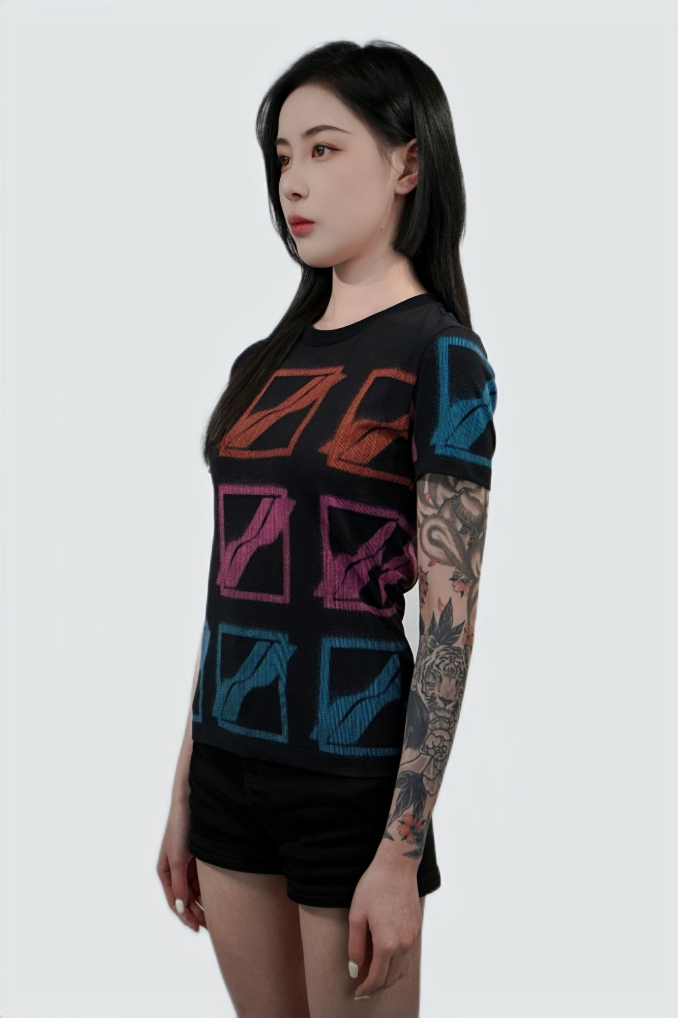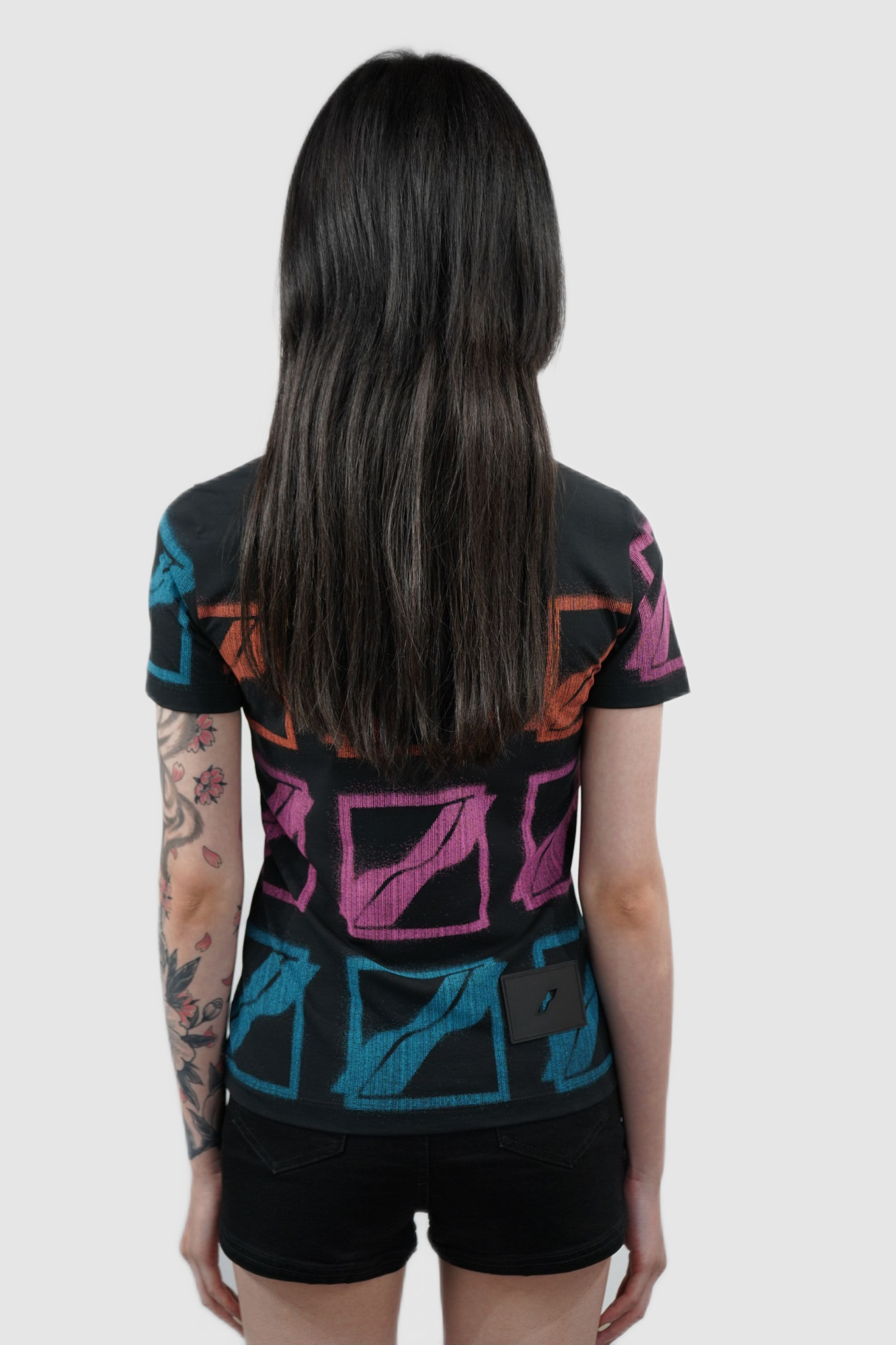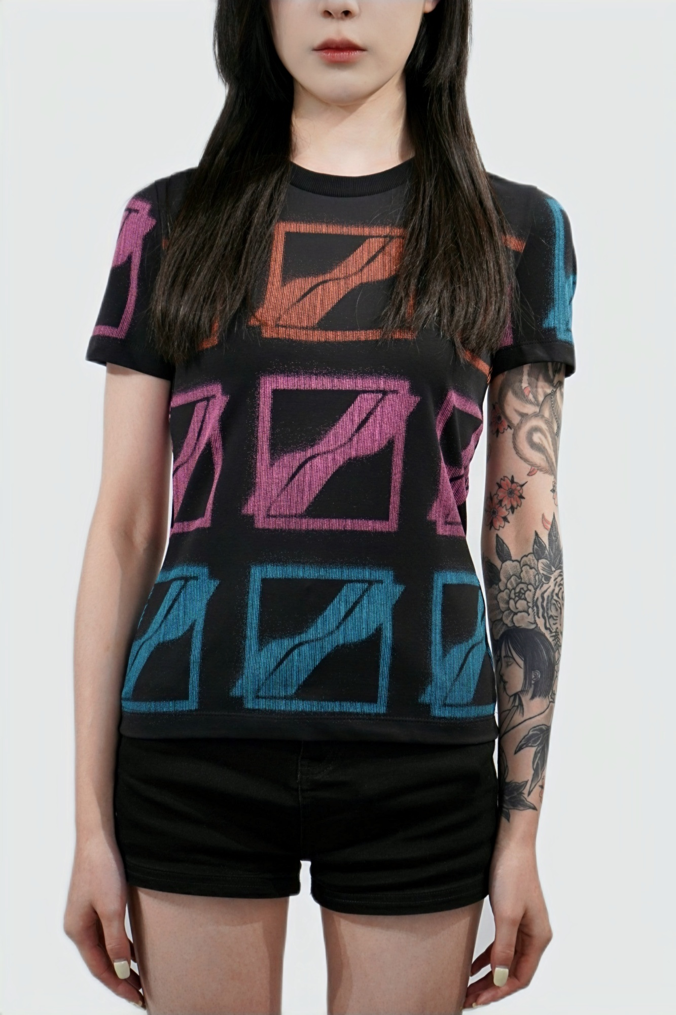 Black oversized T-shirt with multicolored print. Features all-over red, blue, and purple logo prints. Dropped shoulders. Rib-knit crewneck collar in black. Finished with a classic rubber patch in black at the back hem. Tonal stitching throughout.