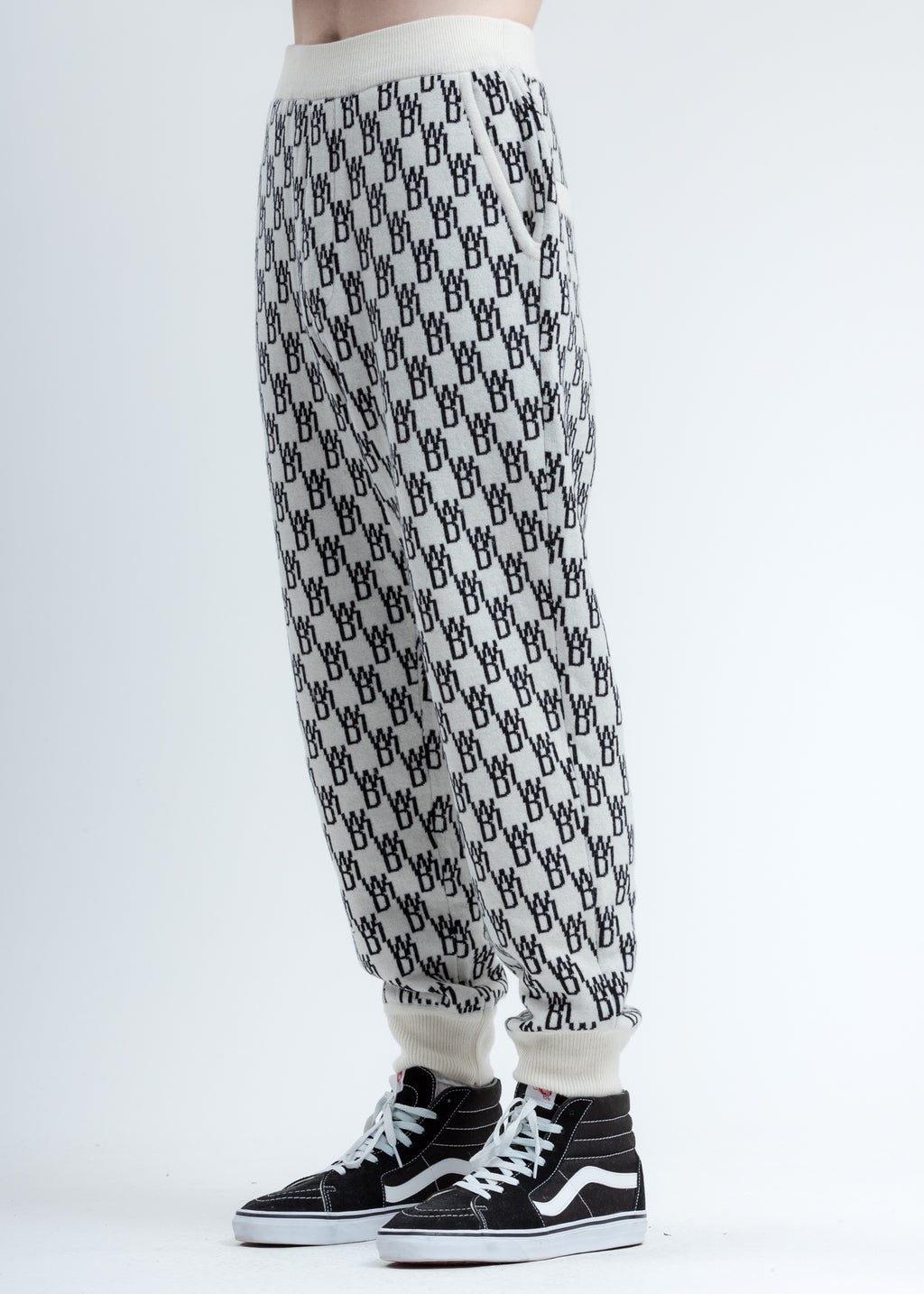 Cashmere blend jacquard print knitted trousers. Features a relaxed fit with pockets at either hip. Finished with a white rib knit elastic waistband and cuffs.