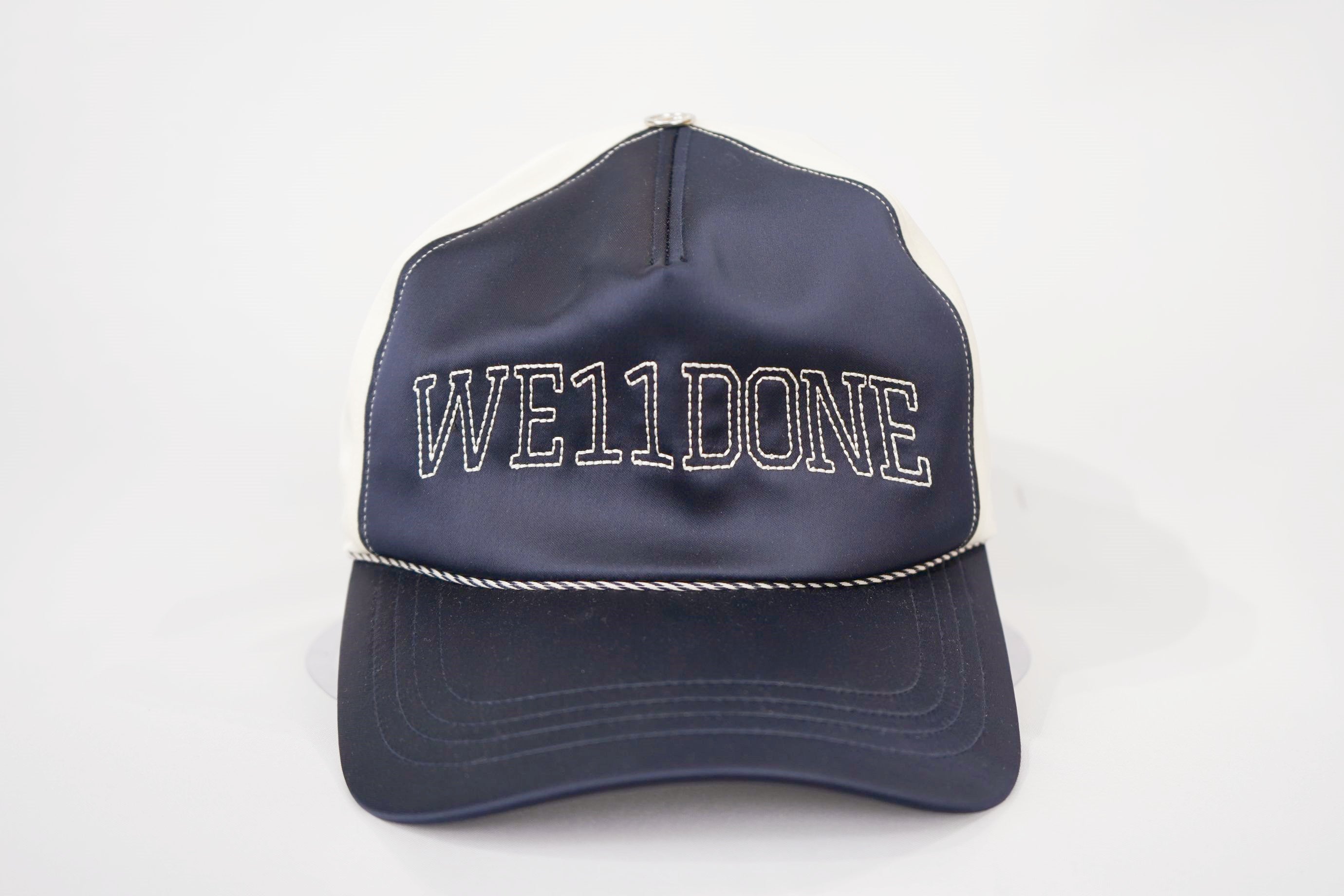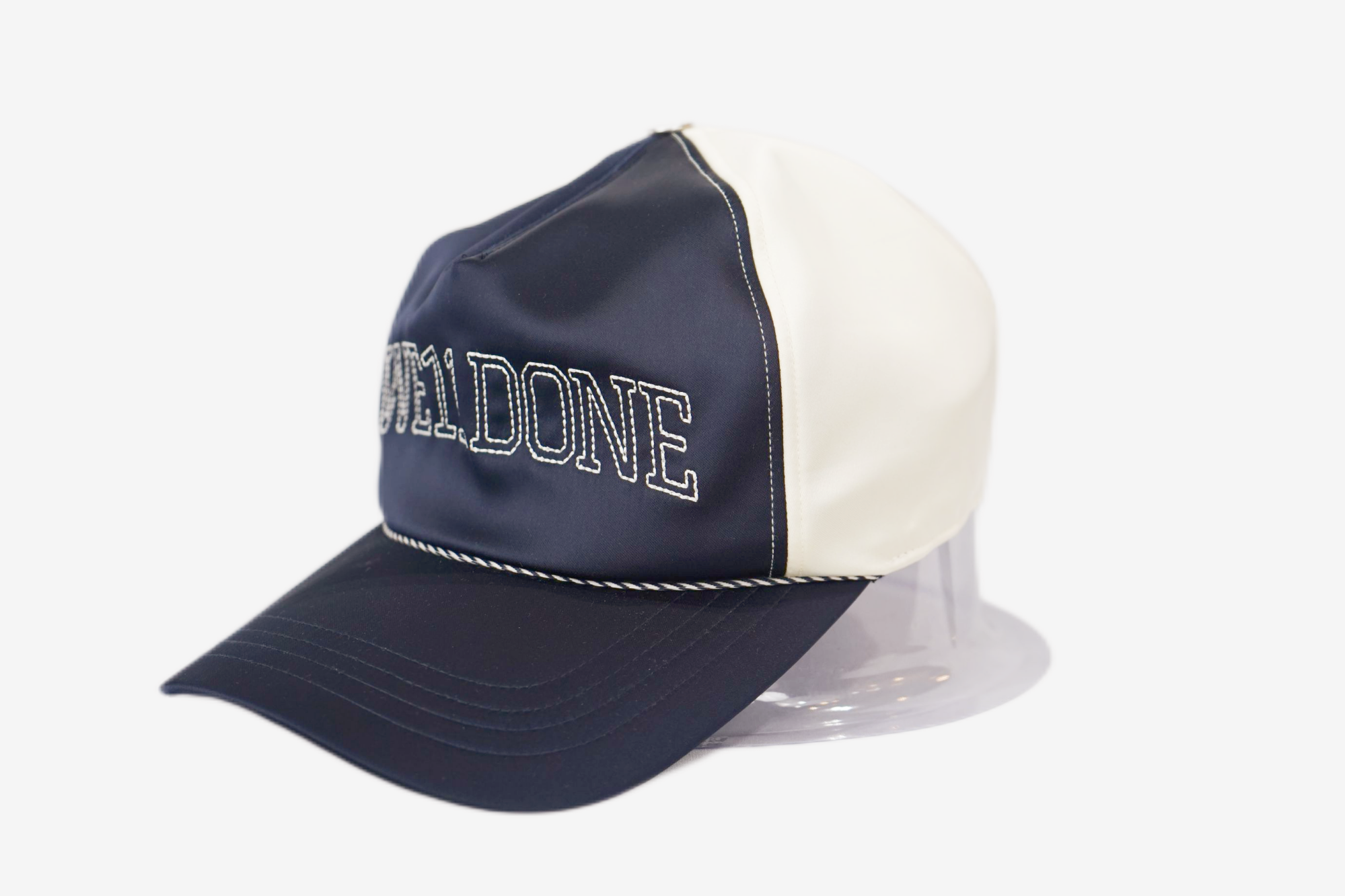 Navy and ivory satin cap. Features a collegiate inspired text print across the front face. Dual tone decorative piping at the top of the brim. Sculpted silver-tone button at the peak. Branded logo tag at the rear fastening strap. Finished with tonal stitching, and black lining. Adjustable fit.