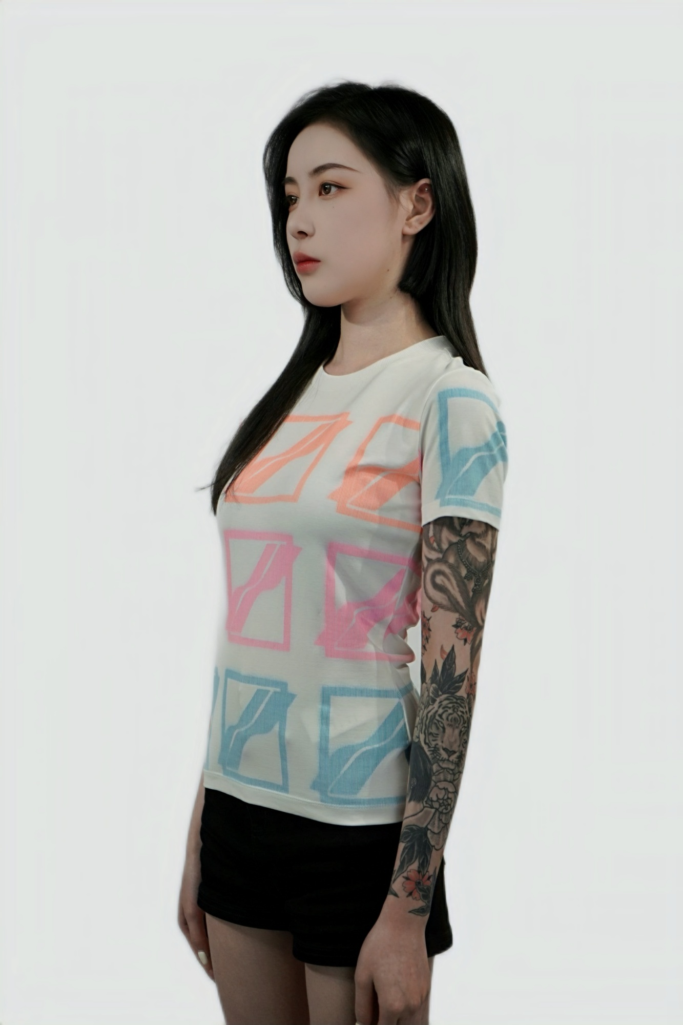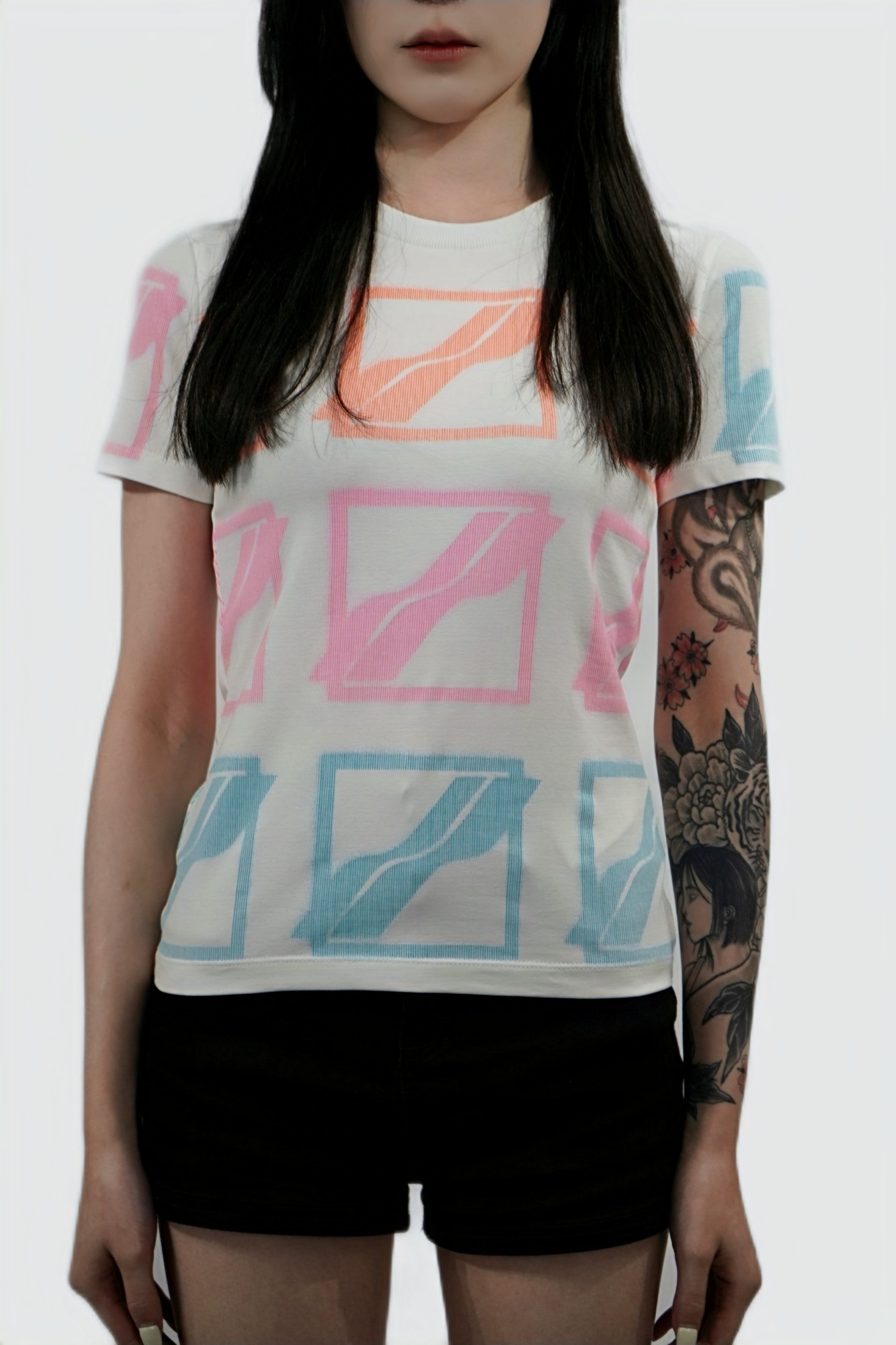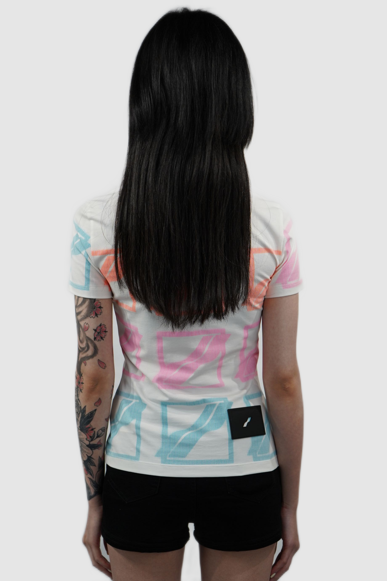 White oversized T-shirt with multicolored print. Features all-over pink and blue logo prints. Dropped shoulders. Rib-knit crewneck collar in white. Finished with a classic rubber patch in black at the back hem. Tonal stitching throughout.