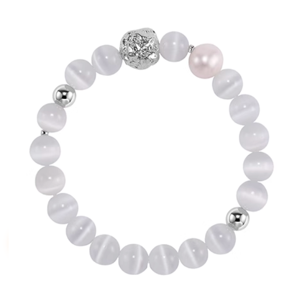 Material: Rhodium plated copper/shell beads (imitation pearl)/ artificial cat's eye Size: adjustable