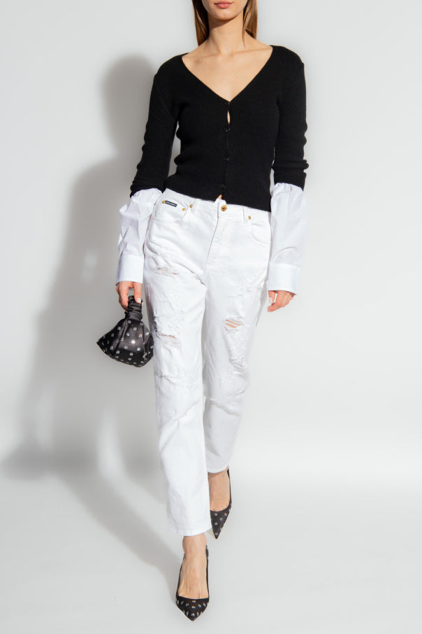 Black cardigan from T by Alexander Wang. Crafted in a wool and yak wool blend, this style features a rib-knit texture and light blue cotton shirt-like cuffs.