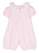 teddy bear-print romper from MONNALISA featuring cloud white, cotton, teddy bear print, logo print to the front, frilled neckline, snap-fit fastening, short sleeves and elasticated ankles.