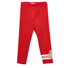 Teen girls red cotton leggings by Italian brand Monnalisa, with an adorable teddy bear logo print on one leg. Full-length, they are made in soft jersey and have a comfortable, elasticated waistband making them easy to wear.