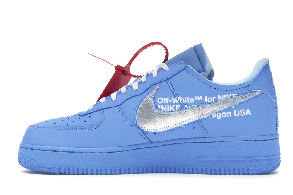 The Air Force 1 Low Off-White MCA University Blue boasts a sky blue leather upper and midsole, a reflective silver deconstructed Nike Swoosh, a red zip tie, white laces and the classic Off-White™ branding below the medial swoosh. This Air Force 1 hit public servers for the first time in June of 2019 for $150 USD