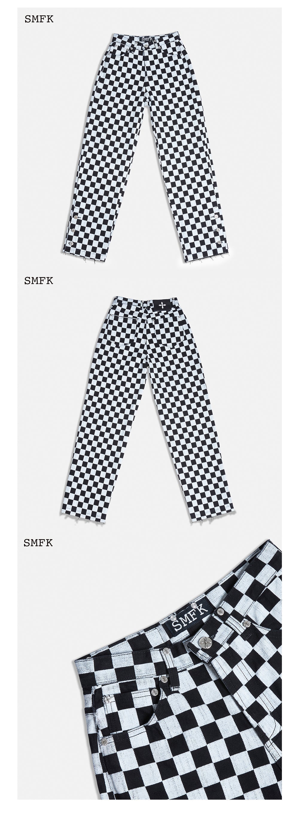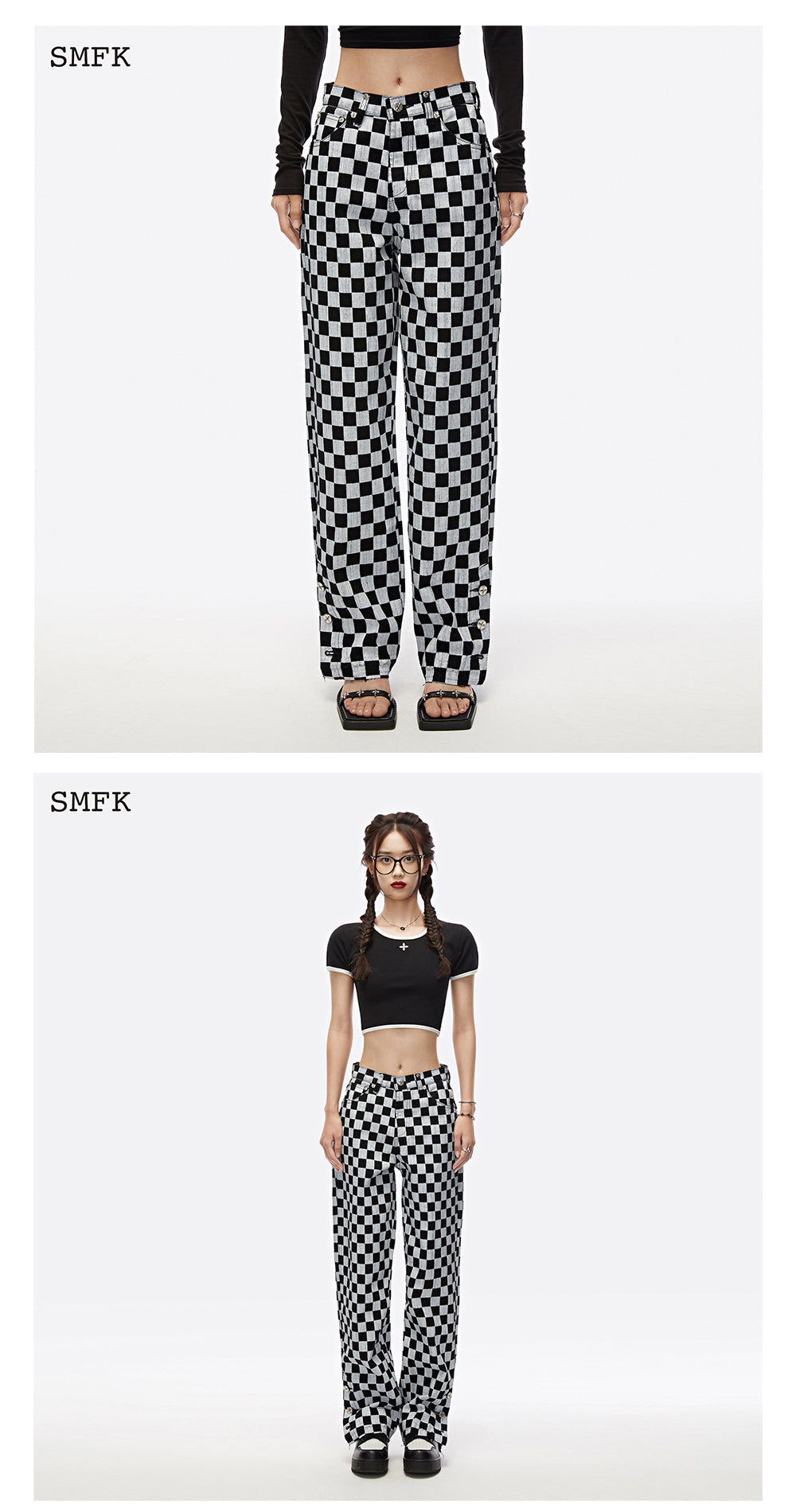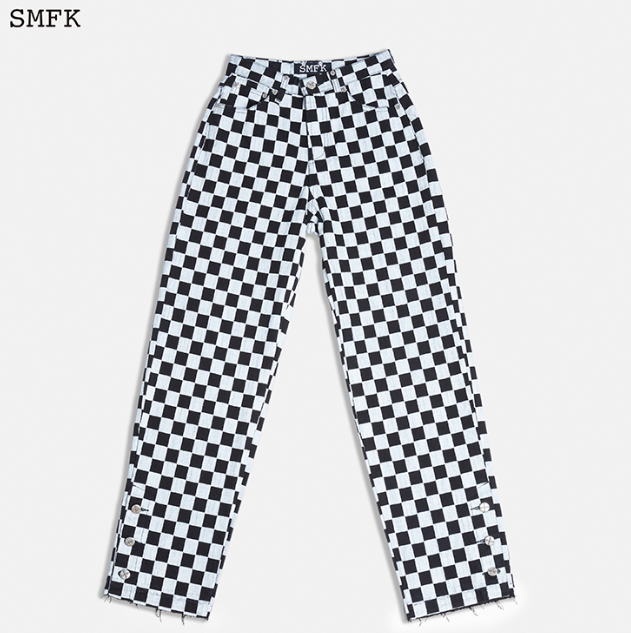 The BLACK AND WHITE MERMAID JEANS feature an all-over checkerboard print with a mid-rise waist and loose, stretched fit. Made for movement and statement-making, these pants deliver comfort and edge in equal measure. Style with a fitted top or oversized hoodie for a head-turning look.