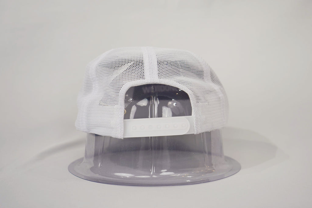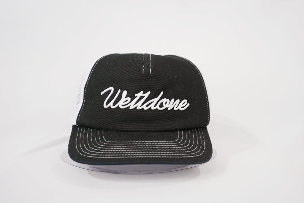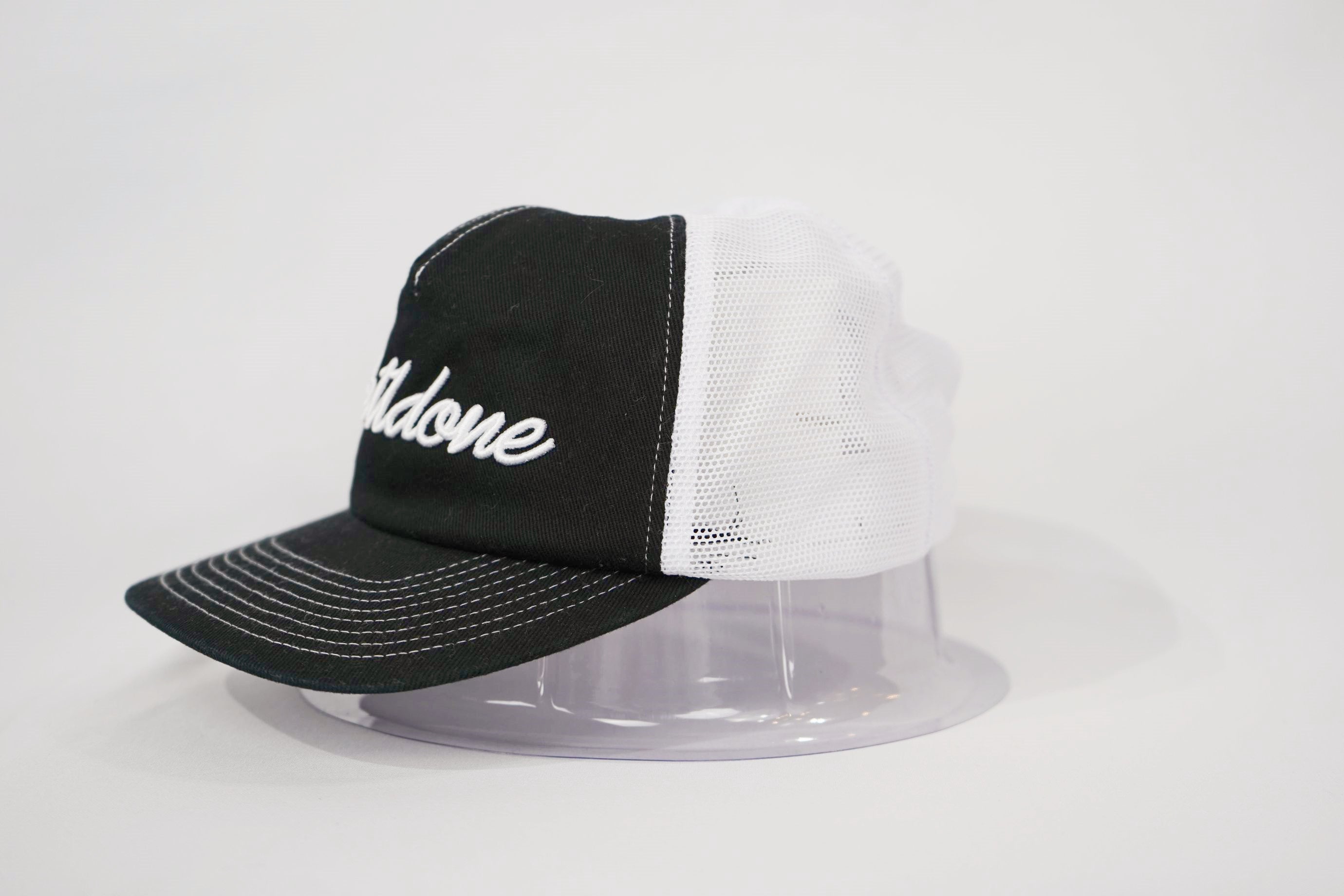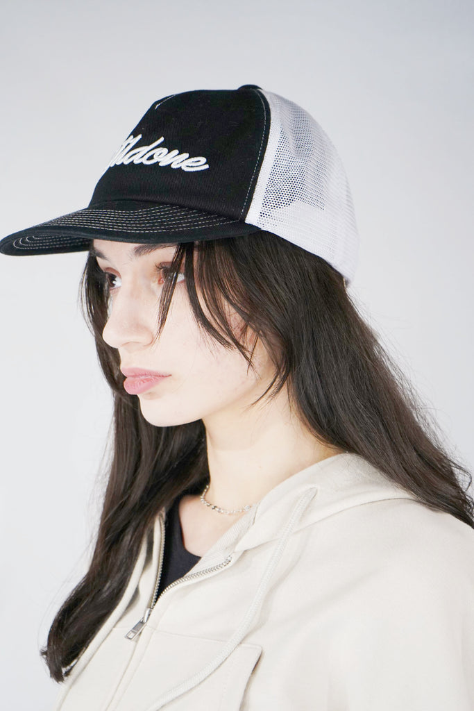 Black and white mesh cap. Features a structured construction. White logo embroidery above the brim. Mesh paneling in white. Adjustable fit.