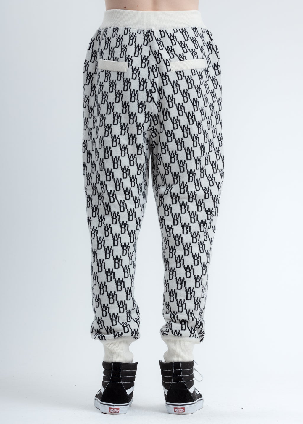 Cashmere blend jacquard print knitted trousers. Features a relaxed fit with pockets at either hip. Finished with a white rib knit elastic waistband and cuffs.